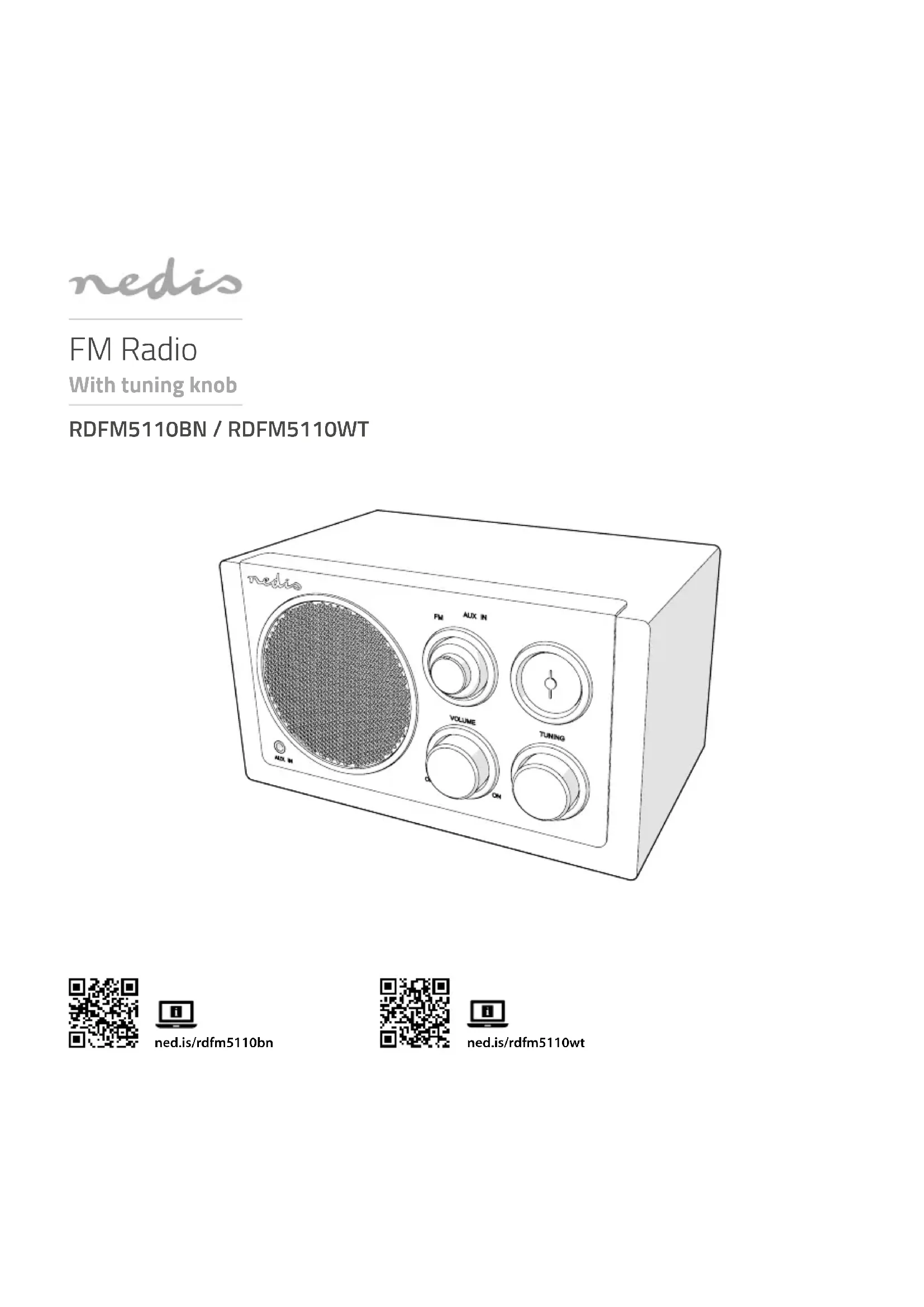 Guide de démarrage rapide Radio FM RDFM5110BN / RDFM5110WTPour plus d'informations, consultez le manuel détaillé en ligne : ned.is/rdfm5110bn ned.is/rdfm5110wt Utilisation prévue La RDFM5110BN/RDFM5110WT est une radio FM qui peut être utilisée pour diuser de l’audio à partir d’un périphérique multimédia externe à l’aide d’un câble auxiliaire.Le produit est prévu pour un usage intérieur uniquement.Ce produit n’est pas destiné à un usage professionnel.Toute modication du produit peut avoir des conséquences sur la sécurité, la garantie et le bon fonctionnement. Pièces principales (image A) 1 Haut-parleur2 Entrée AUX3 Câble d'alimentation4 Antenne5 Indicateur de fréquence6 Molette de mode7 Molette de syntonisation8 Molette de volume Hauptbestandteile (Abbildung A) 1 Lautsprecher2 AUX-Eingang3 Stromkabel4 Antenne5 Frequenzskala6 Modus-Wahlrad7 Tuning-Drehrad8 Lautstärkerad Sicherheitshinweise