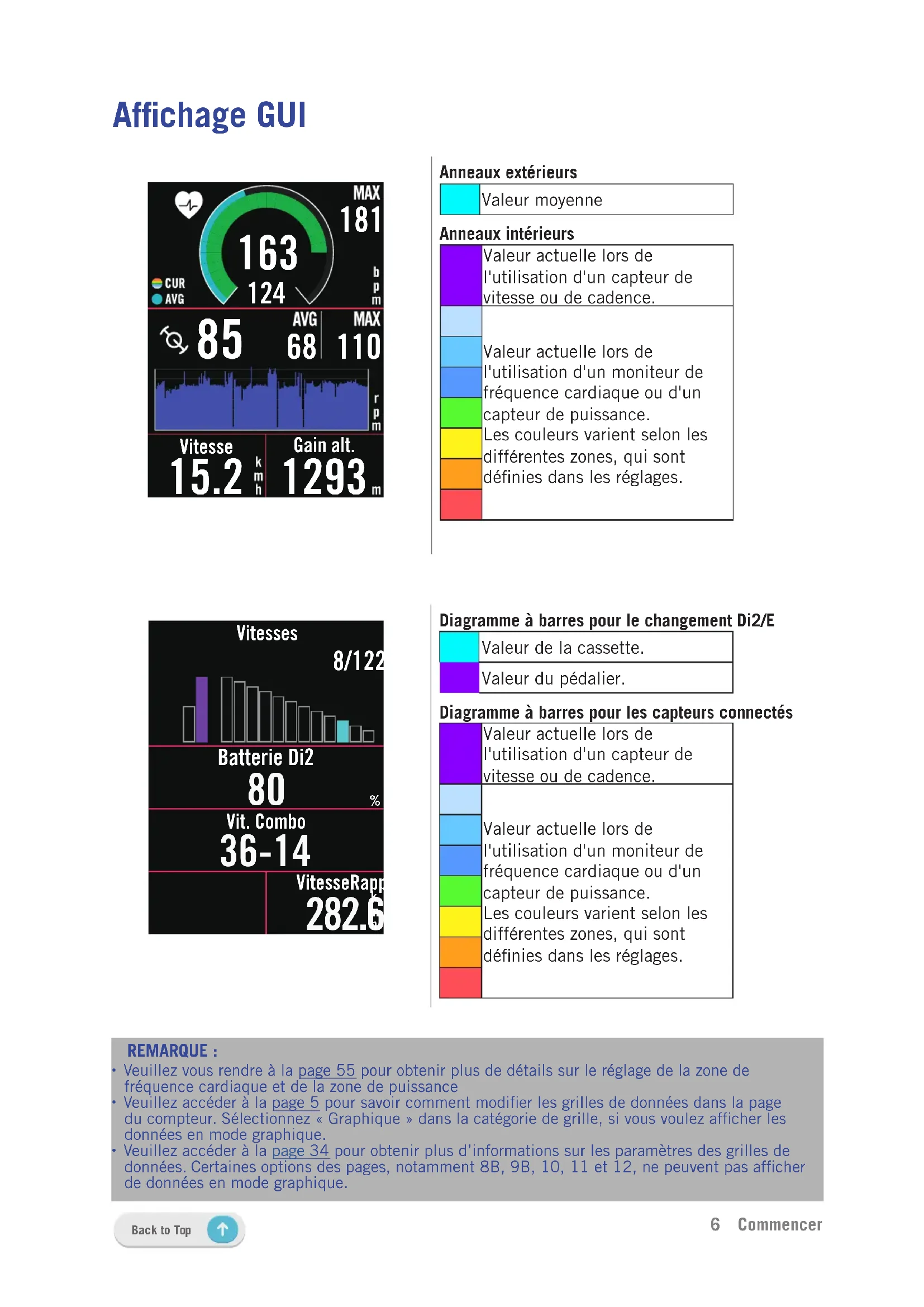 e6 Commencer Back to Top Afchage GUI Anneaux extérieursValeur moyenneAnneaux intérieurs Valeur actuelle lors de l'utilisation d'un capteur de vitesse ou de cadence.Valeur actuelle lors de l'utilisation d'un moniteur de fréquence cardiaque ou d'un capteur de puissance. Les couleurs varient selon les différentes zones, qui sont dénies dans les réglages. Diagramme à barres pour le changement Di2/EValeur de la cassette. Valeur du pédalier.Diagramme à barres pour les capteurs connectésValeur actuelle lors de l'utilisation d'un capteur de vitesse ou de cadence.Valeur actuelle lors de l'utilisation d'un moniteur de fréquence cardiaque ou d'un capteur de puissance. Les couleurs varient selon les différentes zones, qui sont dénies dans les réglages. 8/122/2