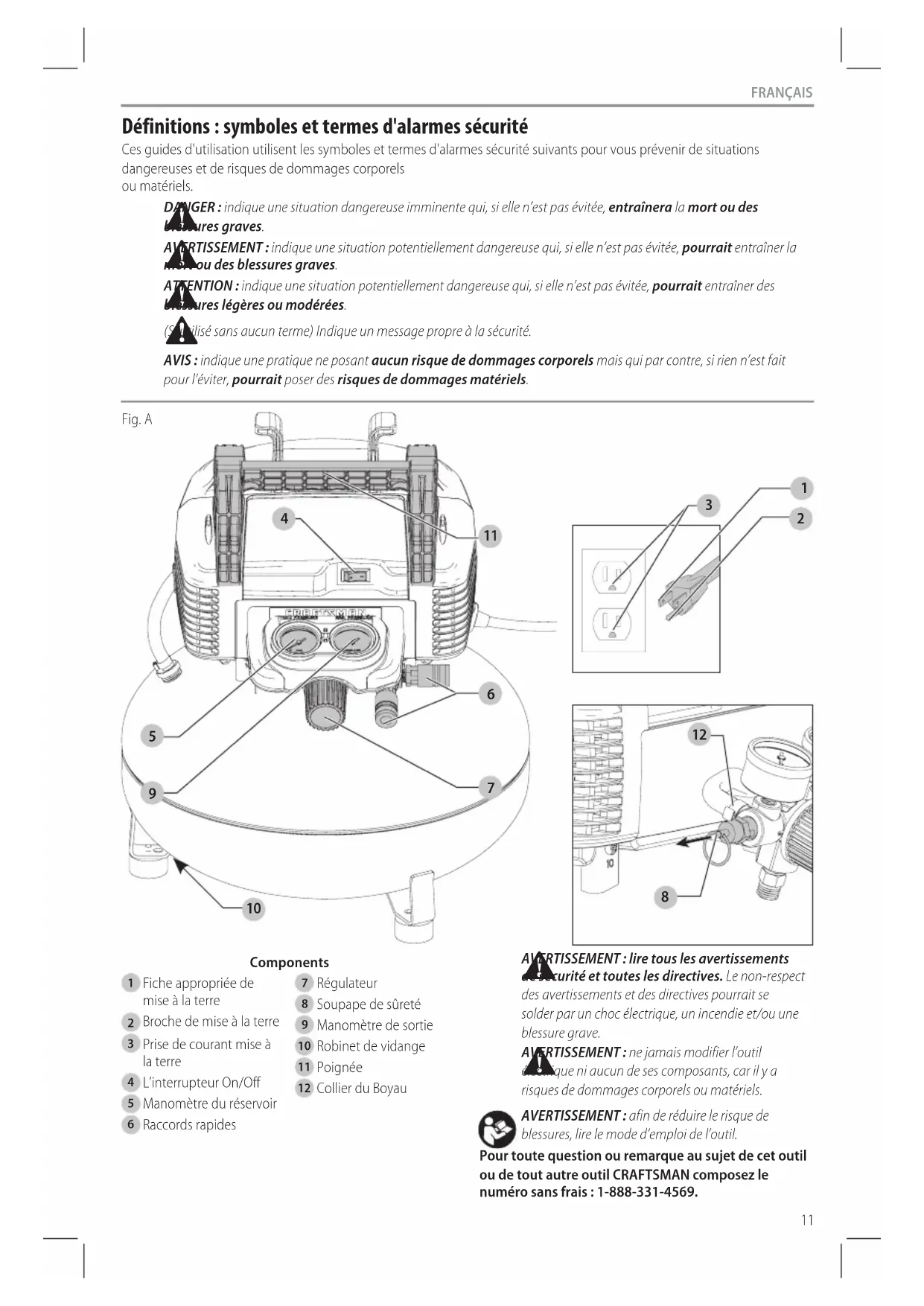 blessures, lire le mode d’emploi del’outil. Pour toute question ou remarque au sujet de cet outil ou de tout autre outil CRAFTSMAN composez le numéro sans frais : 1-888-331-4569. Définitions : symboles et termes d'alarmes sécurité Ces guides d'utilisation utilisent les symboles et termes d'alarmes sécurité suivants pour vous prévenir de situations dangereuses et de risques de dommages corporels ou matériels.