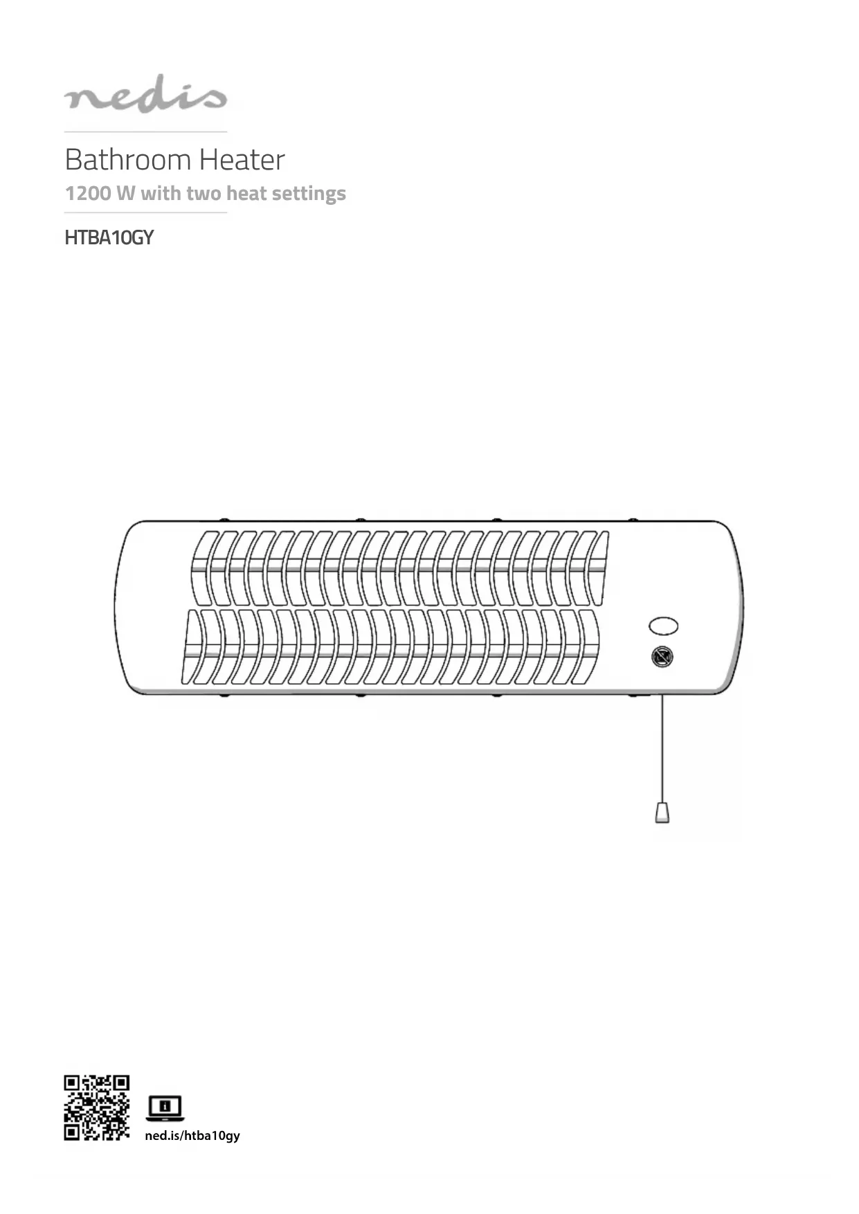 Verkorte handleiding Badkamerkachel HTBA10GYZie voor meer informatie de uitgebreide handleiding online: ned.is/htba10gy Bedoeld gebruik Het product is een kachel waarmee de gebruiker de omgevingstemperatuur in de badkamer kan regelen.Dit product is uitsluitend bedoeld voor gebruik binnenshuis.Dit product is uitsluitend geschikt voor goed geïsoleerde plaatsen of voor incidenteel gebruik.Dit product mag worden gebruikt door kinderen van 8 jaar en ouder en personen met een verminderd lichamelijk, zintuiglijk of geestelijk vermogen, of die gebrek aan ervaring of kennis hebben, als iemand die verantwoordelijk is voor hun veiligheid toezicht op hen houdt of hen is uitgelegd hoe het product veilig dient te worden gebruikt en ze begrijpen wat de potentiële risico's zijn.Kinderen jonger dan 3 jaar moeten uit de buurt worden gehouden, tenzij ze voortdurend onder toezicht staan.Kinderen vanaf 3 jaar en jonger dan 8 jaar mogen het product alleen aan-/uitzetten als het in de beoogde normale gebruiksstand staat of is geïnstalleerd en als iemand toezicht op hen houdt of hen is uitgelegd hoe het product veilig dient te worden gebruikt en ze begrijpen wat de potentiële risico's zijn. Kinderen vanaf 3 jaar en jonger dan 8 jaar mogen het product niet aansluiten, regelen of reinigen en mogen geen onderhoud aan het product uitvoeren.Kinderen mogen niet met het product spelen.Het product is bedoeld voor gebruik in huishoudelijke omgevingen voor typische huishoudelijke functies die ook kunnen worden gebruikt door niet-deskundige gebruikers voor typische huishoudelijke functies, zoals: winkels, kantoren en andere soortgelijke werkomgevingen, boerderijen, door klanten in hotels, motels en andere woonomgevingen en/of in omgevingen van het type “bed & breakfast”.Dit product is niet geschikt voor primaire verwarmingsdoeleinden.Elke wijziging van het product kan gevolgen hebben voor veiligheid, garantie en correcte werking. Specicaties Product BadkamerkachelArtikelnummer HTBA10GYAfmetingen (l x b x h) 100 x 560 x 160 mmIngangsvermogen 220-240 V ~ 50 HzNominaal vermogen 1000 - 1200 WWaterdicht IPX4Kabellengte 1,4 m Belangrijkste onderdelen (afbeelding A) 1 Badkamerkachel 2 Wandmontage 3 Montagegat 4 Wandmontage deksel 5 Stroomkabel 6 Schroeven (2x) 7 Pluggen (2x) 8 Modus-indicator 9 Trekkoord