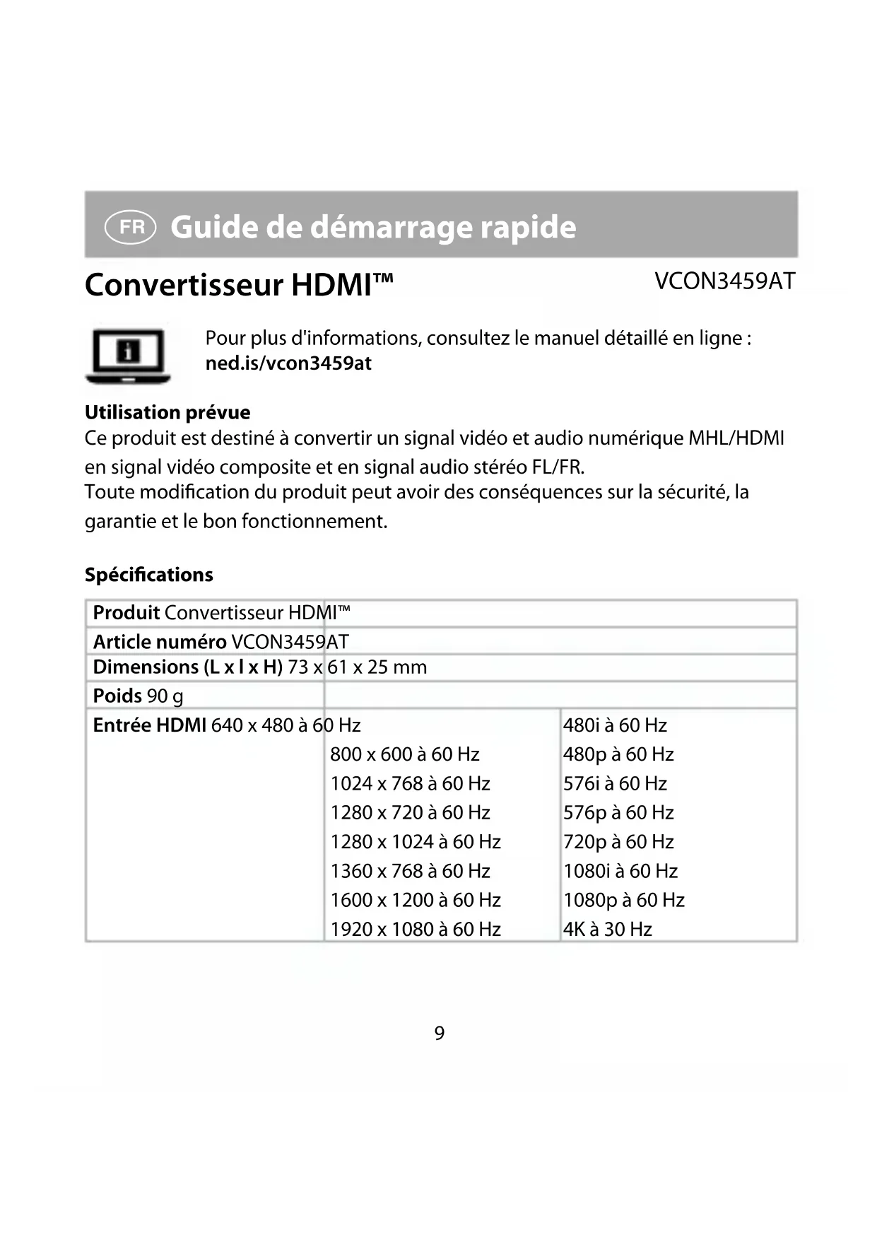 Guide de démarrage rapide Convertisseur HDMI™ VCON3459AT Pour plus d'informations, consultez le manuel détaillé en ligne : ned.is/vcon3459at Utilisation prévue Ce produit est destiné à convertir un signal vidéo et audio numérique MHL/HDMI en signal vidéo composite et en signal audio stéréo FL/FR. Toute modication du produit peut avoir des conséquences sur la sécurité, la garantie et le bon fonctionnement. Spécications Produit Convertisseur HDMI™ Article numéro VCON3459AT Dimensions (L x l x H) 73 x 61 x 25 mm Poids 90 g Entrée HDMI 640 x 480 à 60 Hz 800 x 600 à 60 Hz 1024 x 768 à 60 Hz 1280 x 720 à 60 Hz 1280 x 1024 à 60 Hz 1360 x 768 à 60 Hz 1600 x 1200 à 60 Hz 1920 x 1080 à 60 Hz 480i à 60 Hz 480p à 60 Hz 576i à 60 Hz 576p à 60 Hz 720p à 60 Hz 1080i à 60 Hz 1080p à 60 Hz 4K à 30 Hz10 Sortie péritel PAL / NTSC 480i / 576i à 50 / 60 Hz Puissance d'entrée 5 VDC ; 1 A Pièces principales (image A) 1 Port d'alimentation 2 Voyant LED d'alimentation 3 Commutateur PAL / NTSC 4 Entrée HDMI 5 Sortie audio 3,5 mm 6 Sortie péritel 7 Câble d'alimentation Consignes de sécurité