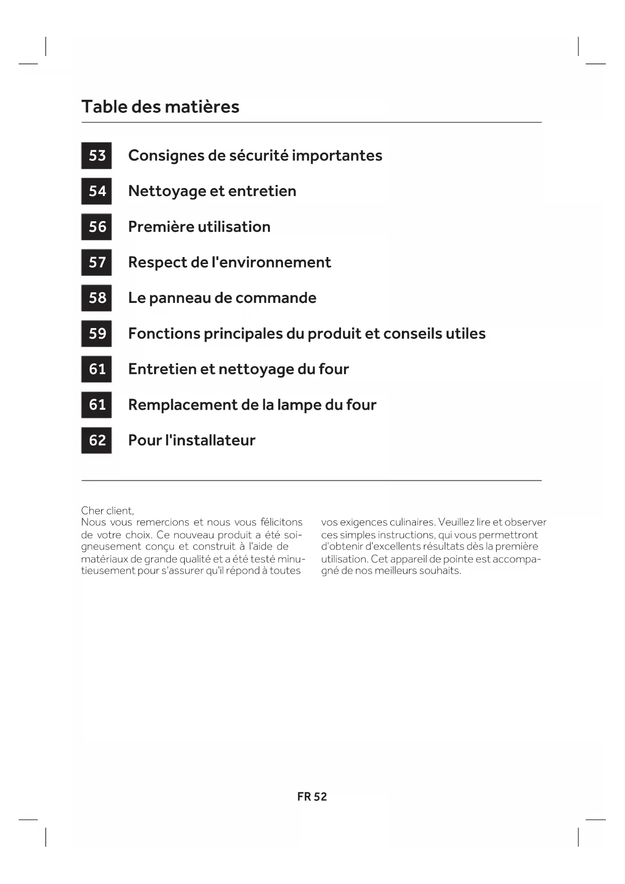 SASO H05RR-F 3x1,5 mm² H05RR-F 3x2,5 mm² H05VV-F 3x1,5 mm² H05VV-F 3x2,5 mm² H05RN-F 3x1,5 mm² H05RN-F 3x2,5 mm² H05V2V2-F 3x1,5 mm² H05V2V2-F 3x2,5 mm²FR 52 Cher client, Nous vous remercions et nous vous félicitons de votre choix. Ce nouveau produit a été soi- gneusement conçu et construit à l'aide de matériaux de grande qualité et a été testé minu- tieusement pour s'assurer qu'il répond à toutes vos exigences culinaires. Veuillez lire et observer ces simples instructions, qui vous permettront d'obtenir d'excellents résultats dès la première utilisation. Cet appareil de pointe est accompa- gné de nos meilleurs souhaits. Consignes de sécurité importantes Nettoyage et entretien Première utilisation Respect de l'environnement Le panneau de commande Fonctions principales du produit et conseils utiles Entretien et nettoyage du four Remplacement de la lampe du four Pour l'installateur