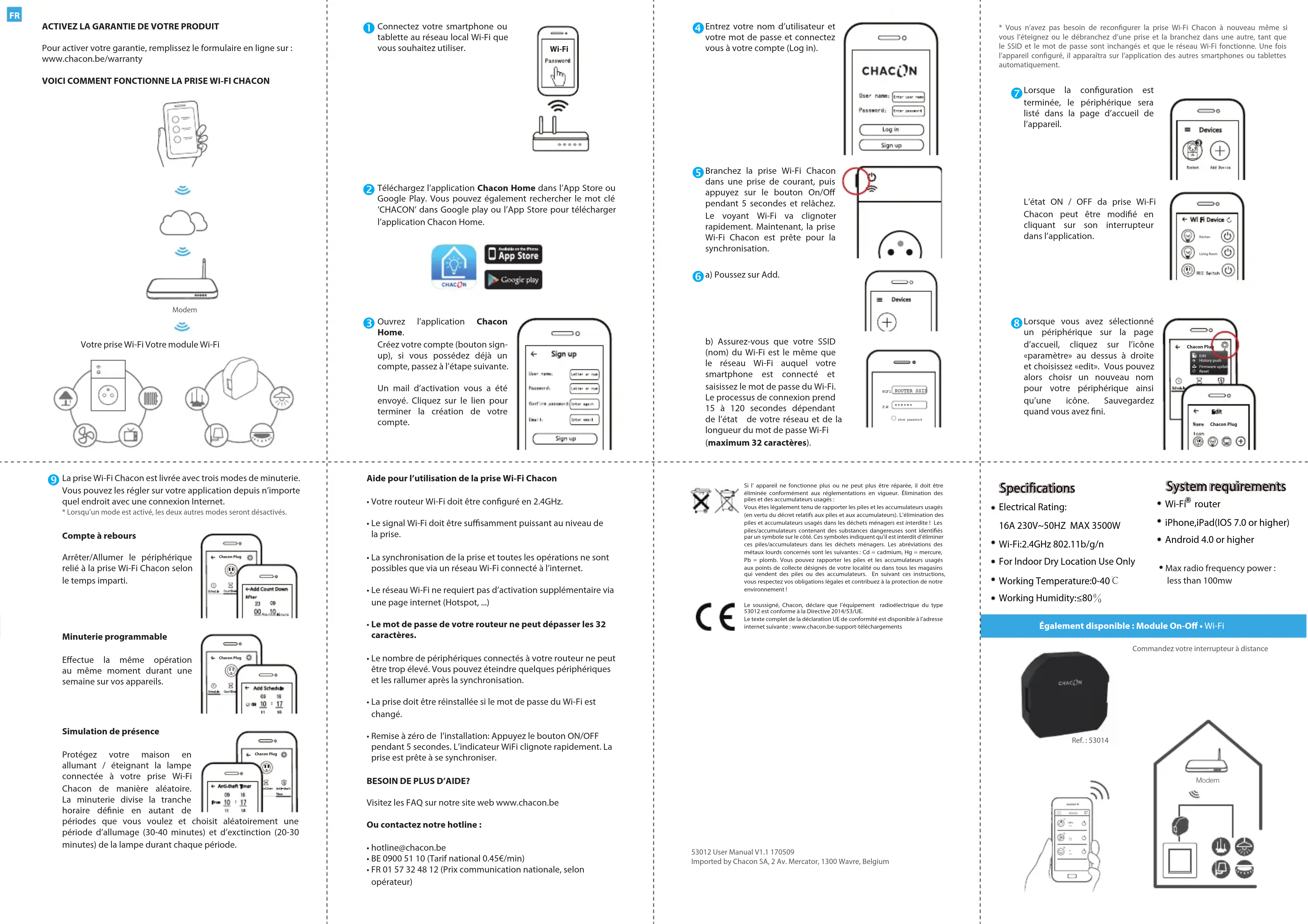 Chacon PlugChacon PlugChacon PlugChacon PlugLiving RoomKitchen P.W WiFi ROUTER SSID show password Connect ACTIVEZ LA GARANTIE DE VOTRE PRODUITPour activer votre garantie, remplissez le formulaire en ligne sur : www.chacon.be/warrantyAide pour l’utilisation de la prise Wi-Fi Chacon• Votre routeur Wi-Fi doit être conguré en 2.4GHz.• Le signal Wi-Fi doit être susamment puissant au niveau de la prise.• La synchronisation de la prise et toutes les opérations ne sont possibles que via un réseau Wi-Fi connecté à l’internet.• Le réseau Wi-Fi ne requiert pas d’activation supplémentaire via une page internet (Hotspot, ...)• Le mot de passe de votre routeur ne peut dépasser les 32 caractères.• Le nombre de périphériques connectés à votre routeur ne peut être trop élevé. Vous pouvez éteindre quelques périphériques et les rallumer après la synchronisation.• La prise doit être réinstallée si le mot de passe du Wi-Fi est changé.• Remise à zéro de l’installation: Appuyez le bouton ON/OFF pendant 5 secondes. L’indicateur WiFi clignote rapidement. La prise est prête à se synchroniser.BESOIN DE PLUS D’AIDE?Visitez les FAQ sur notre site web www.chacon.beOu contactez notre hotline:• hotline@chacon.be• BE 0900 51 10 (Tarif national 0.45€/min) • FR 01 57 32 48 12 (Prix communication nationale, selon opérateur)VOICI COMMENT FONCTIONNE LA PRISE WI-FI CHACONVotre prise Wi-Fi Votre module Wi-FiModemTéléchargez l’application Chacon Home dans l’App Store ou Google Play. Vous pouvez également rechercher le mot clé ‘CHACON’ dans Google play ou l’App Store pour télécharger l’application Chacon Home.Connectez votre smartphone ou tablette au réseau local Wi-Fi que vous souhaitez utiliser.Ouvrez l’application Chacon Home. Créez votre compte (bouton sign- up), si vous possédez déjà un compte, passez à l’étape suivante.Un mail d’activation vous a été envoyé. Cliquez sur le lien pour terminer la création de votre compte.Entrez votre nom d’utilisateur et votre mot de passe et connectez vous à votre compte (Log in).Branchez la prise Wi-Fi Chacon dans une prise de courant, puis appuyez sur le bouton On/O pendant 5 secondes et relâchez. Le voyant Wi-Fi va clignoter rapidement. Maintenant, la prise Wi-Fi Chacon est prête pour la synchronisation.a) Poussez sur Add.b) Assurez-vous que votre SSID (nom) du Wi-Fi est le même que le réseau Wi-Fi auquel votre smartphone est connecté et saisissez le mot de passe du Wi-Fi. Le processus de connexion prend 15 à 120 secondes dépendant de l’état de votre réseau et de la longueur du mot de passe Wi-Fi (maximum 32 caractères).