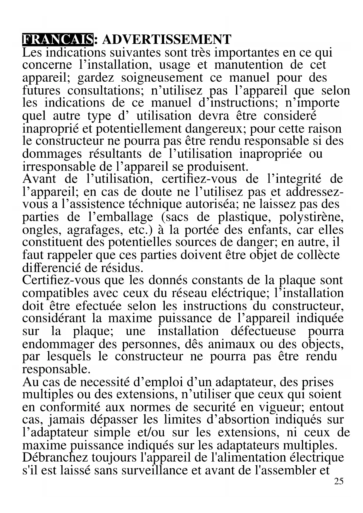 - Zur Reinigung des Kochfeldes (3 und 6) und des Gehäuses (7) kann heißes, aber nicht kochendes Wasser und normales, alkalifreies Spülmittel verwendet werden.25 FRANCAIS: ADVERTISSEMENT Les indications suivantes sont très importantes en ce qui concerne l’installation, usage et manutention de cet appareil; gardez soigneusement ce manuel pour des futures consultations; n’utilisez pas l’appareil que selon les indications de ce manuel d’instructions; n’importe quel autre type d’ utilisation devra être consideré inaproprié et potentiellement dangereux; pour cette raison le constructeur ne pourra pas être rendu responsable si des dommages résultants de l’utilisation inapropriée ou irresponsable de l’appareil se produisent. Avant de l’utilisation, certifiez-vous de l’integrité de l’appareil; en cas de doute ne l’utilisez pas et addressez- vous a l’assistence téchnique autoriséa; ne laissez pas des parties de l’emballage (sacs de plastique, polystirène, ongles, agrafages, etc.) à la portée des enfants, car elles constituent des potentielles sources de danger; en autre, il faut rappeler que ces parties doivent être objet de collècte differencié de résidus. Certifiez-vous que les donnés constants de la plaque sont compatibles avec ceux du réseau eléctrique; l’installation doit être efectuée selon les instructions du constructeur, considérant la maxime puissance de l’appareil indiquée sur la plaque; une installation défectueuse pourra endommager des personnes, dês animaux ou des objects, par lesquels le constructeur ne pourra pas être rendu responsable. Au cas de necessité d’emploi d’un adaptateur, des prises multiples ou des extensions, n’utiliser que ceux qui soient en conformité aux normes de securité en vigueur; entout cas, jamais dépasser les limites d’absortion indiqués sur l’adaptateur simple et/ou sur les extensions, ni ceux de maxime puissance indiqués sur les adaptateurs multiples. Débranchez toujours l'appareil de l'alimentation électrique s'il est laissé sans surveillance et avant de l'assembler et26 de le désassembler. Pour le nettoyage déconnectez la fiche du secteur électrique. Ne pas laisser l’appareil inutilemente connecté a la prise eléctrique; c’est toujours mieux de le déconnecter quand il n’est pas à l’use. Quand l’appareil soit hors usage et ait été décidé qu’il ne sera pas reparé, on reccomande son inutilisation, en coupant son câble d’alimentation. - Ne pas utiliser l’appareil si le câble d’alimentation ou la fiche de connéction eléctrique sont endommagés, ou encore en cas de court-circuits; dans ce cas là, apporter l’appareil a un centre d’assistence autorisé. - Ne pas approcher le câble d’alimentation d’objects coupants ou de surfaces chaudes, et ne pas tirer sur le cordon d’alimentation pour le débrancher de la prise. Ne le laissez pas pendre du plan de travail où un enfant pourrait le tenir. - L’appareil n’est pas indiqué pour être exposé à des conditions météorologiques défavorables (pluie, vent, humidité, la glace, etc.); Gardez-le dans un endroit sec. Jamais opérer ou même toucher l’appareil avec les mains mouillées ou les pieds nus. - Ce produit ne doit pas être utilisé par les enfants, même s'ils ont plus de 8 ans. - Cet appareil peut être utilisé par des personnes ayant des capacités physiques, sensorielles ou mentales réduites, ou qui manquent d'expérience ou de connaissances, si elles ont été correctement supervisées ou ont reçu des instructions pour utiliser cet appareil en toute sécurité. - Gardez l’appareil et le câble d’alimentation hors la portée des enfants agés de moins de 8 ans. - Les enfants ne doivent pas jouer avec cet appareil. - L’appareil est pour l’usage domestique et intérieur. Au cas de panne et/ou de mauvais fonctionnement, ne pas intervenir sur l’ appareil. Pour une éventuel réparation27 s’addresser uniquement a un centre autorisé par le constructeur, en demandant dês pièces de remplacement originaux. Le non respect de ces indications peut compromettre la securité de l’appareil e rendre invalides les termes de la garantie. ATTENTION: Cet appareil comporte une fonction de chauffage. Quelques surfaces, même si non la plaque elle même, pourront atteindre des températures élevées. Étant donné que la sensibilité à la température diffère de personne à personne, cet appareil devrà être usé avec PRUDENCE. Placez l’appareil sur des surfaces adéhrentes et préparées pour cet effet, et utilisez les mésures de protection contre la chaleur conseillées, comme dês poignées ou des gants de cuisine. - Cet appareil est destiné à être utilisé dans les ménages et des applications similaires: les cuisines du personnel dans les magasins, bureaux et autres environnements de travail, pour les clients dans les hôtels, motels et autres environnements de type résidentiel, de type lit et petit- déjeuner, hébergement. - L’appareil n’est pas conçu pour être utilisé avec une minuterie extérieure ou un commande à distance. - N’utiliser que des accéssoires e pièces d’origine. - Avant chaque utilisation, effectuez le cordon d'alimentation. Ne soumettez pas le produit à des chocs susceptibles de l'endommager.