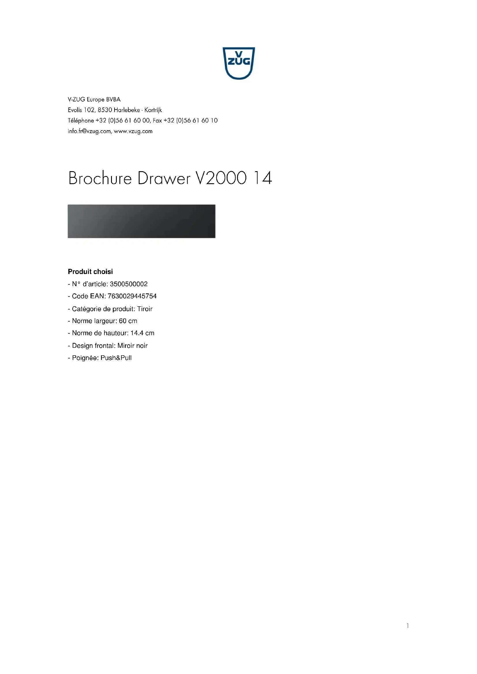 V-ZUG Europe BVBA Evolis 102, 8530 Harlebeke - Kortrijk Téléphone +32 (0)56 61 60 00, Fax +32 (0)56 61 60 10 info.fr@vzug.com, www.vzug.com Brochure Drawer V2000 14 Produit choisi - N° d’article: 3500500002 - Code EAN: 7630029445754 - Catégorie de produit: Tiroir - Norme largeur: 60 cm - Norme de hauteur: 14.4 cm - Design frontal: Miroir noir - Poignée: Push&Pull 1Détails Drawer V2000 14 Design - Catégorie de produit: Tiroir - Norme largeur: 60 cm - Norme de hauteur: 14.4 cm - Design frontal: Miroir noir - Poignée: Push&Pull Dimensions - Hauteur de niche: 144 mm - Largeur de niche: 600 mm - Profondeur de niche: 570 mm - Hauteur de l’appareil: 142 mm - Largeur de l’appareil: 596 mm - Profondeur de l’appareil: 560 mm - Volume: 32 l - Poids à vide: 10 kg Caractéristiques tiroir cuisine - Élément coulissant à sortie totale télescopique stable - Type de tiroir: Tiroir système Informations complémentaires - Niveau d'équipement: 3 Service et interfaces - Garantie: 2 ans