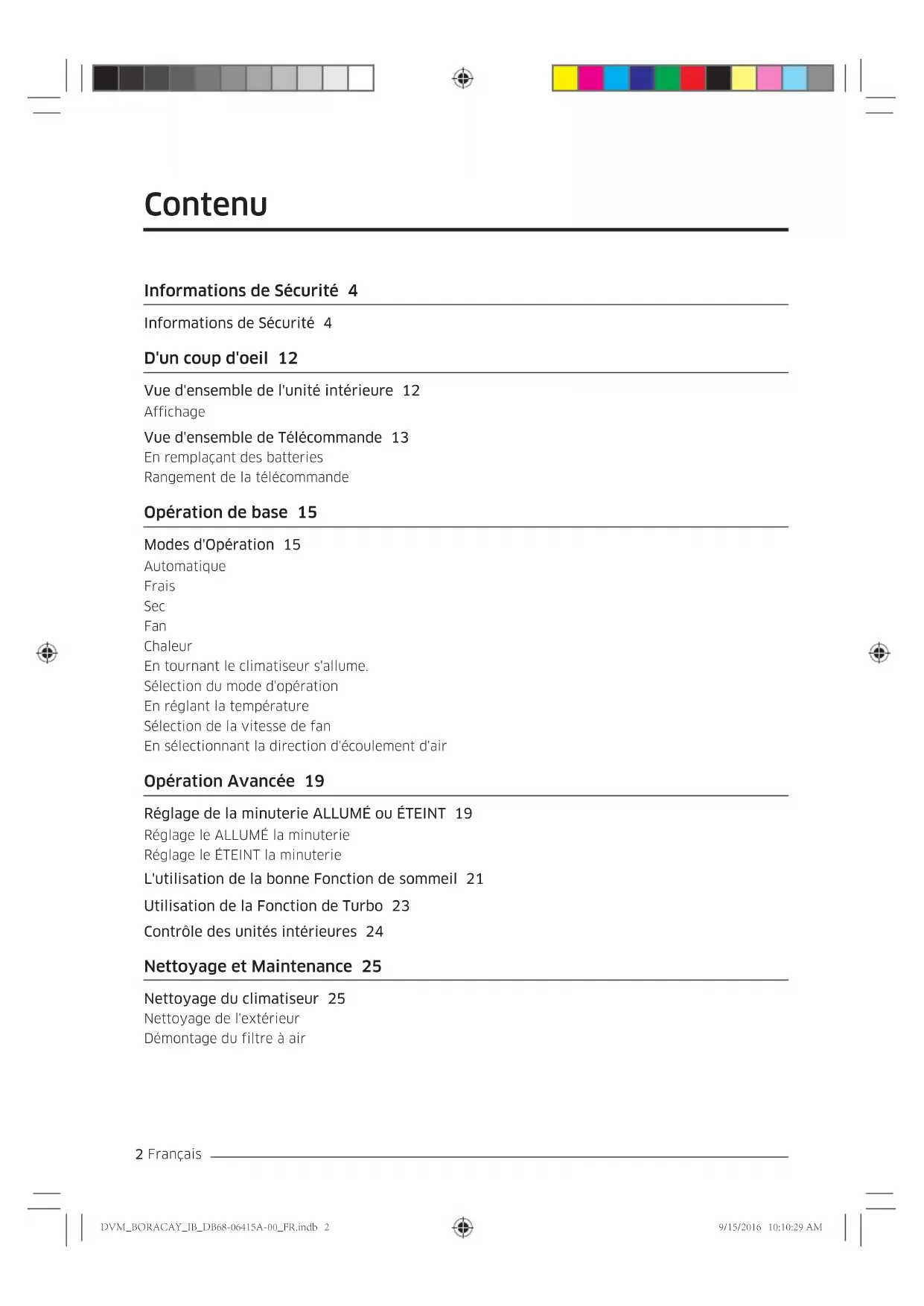 - Cela peut entraîner chez les enfants sérieusement se blessant. Informations de Sécurité DVM_BORACAY_IB_DB68-06415A-00_FR.indb 8DVM_BORACAY_IB_DB68-06415A-00_FR.indb 8 9/15/2016 10:10:31 AM9/15/2016 10:10:31 AM9 Français Informations de SécuritéInformations de Sécurité N'utilisez pas ce climatiseur pendant les périodes longues de l'heure dans les emplacements mal aérés ou près des gens infirmes.