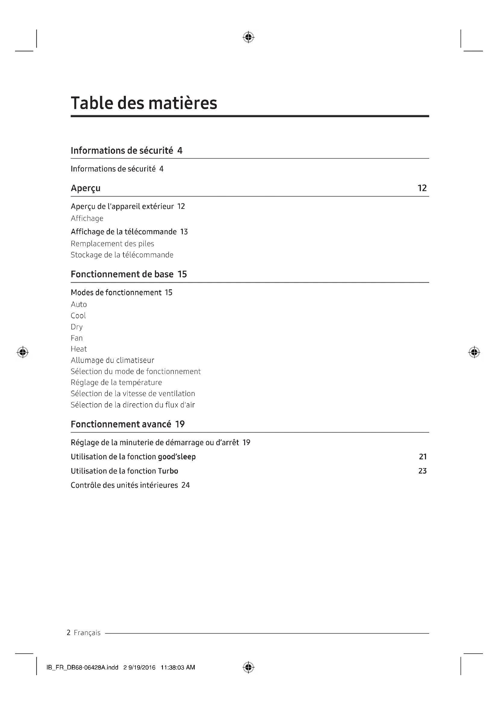 ꞏ Merci d'avoir choisi un climatiseur Samsung. ꞏ Avant d'utiliser cet appareil, veuillez lire attentivement le contenu de ce manuel et conservez-le pour pouvoir vous y reporter par la suite. IB_FR_DB68-06428A.indd 1 9/19/2016 11:38:02 AM2 Français Table des matières Informations de sécurité 4 Informations de sécurité 4 Aperçu 12 Aperçu de l'appareil extérieur 12 Affichage Affichage de la télécommande 13 Remplacement des piles Stockage de la télécommande Fonctionnement de base 15 Modes de fonctionnement 15 Auto Cool Dry Fan Heat Allumage du climatiseur Sélection du mode de fonctionnement Réglage de la température Sélection de la vitesse de ventilation Sélection de la direction du flux d'air Fonctionnement avancé 19 Réglage de la minuterie de démarrage ou d’arrêt 19 Utilisation de la fonction good’sleep 21 Utilisation de la fonction Turbo 23 Contrôle des unités intérieures 24 IB_FR_DB68-06428A.indd 2 9/19/2016 11:38:03 AM3 Français Nettoyage et maintenance 25 Nettoyage du climatiseur 25 Nettoyage de l'extérieur Démontage du filtre à air Nettoyage du filtre à air Remontage du filtre à air Entretien du climatiseur 27