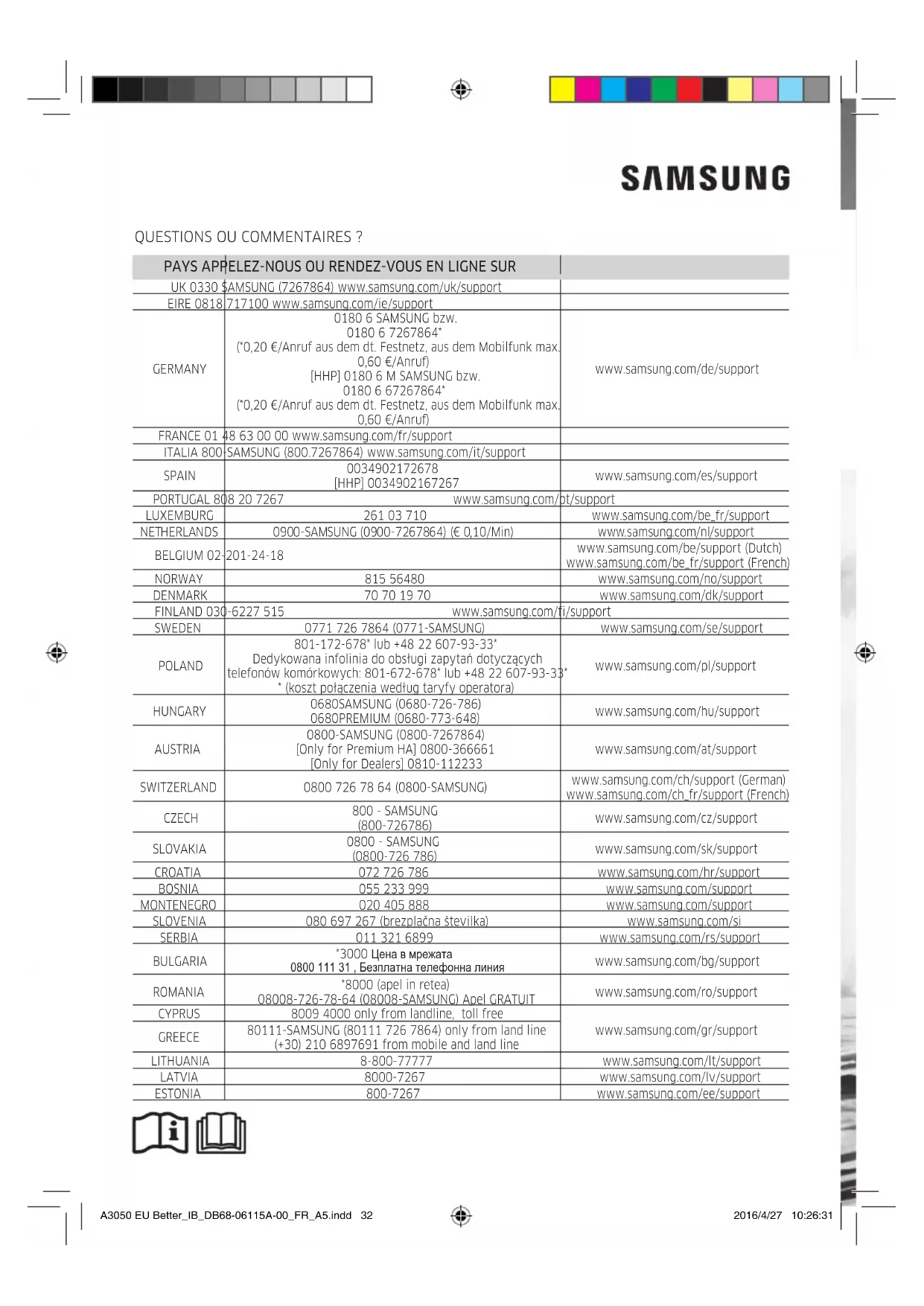 - De la condensation peut se développer lorsque la température ambiante change considérablement. Il s'agit d'un fonctionnement normal. A3050 EU Better_IB_DB68-06115A-00_FR_A5.indd 32 2016/4/27 10:26:39