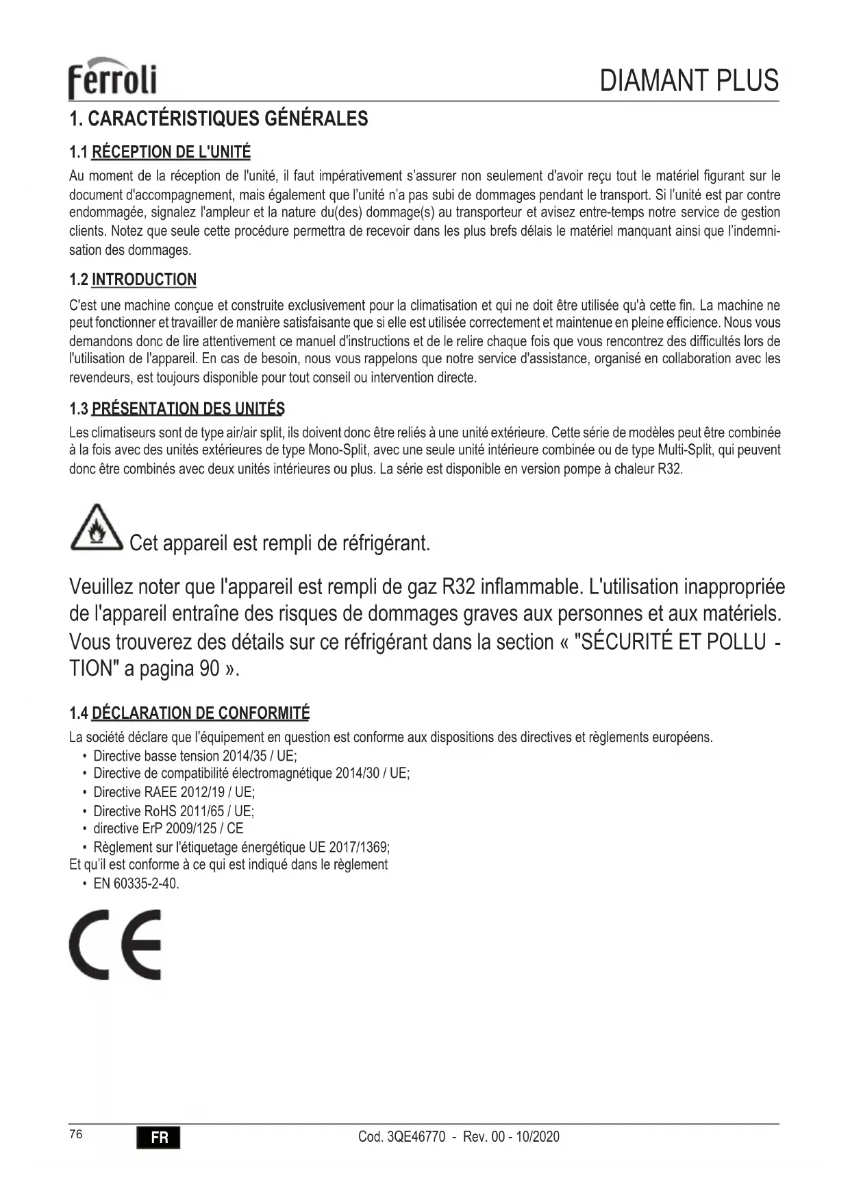 La société déclare que l’équipement en question est conforme aux dispositions des directives et règlements européens.• Directive basse tension 2014/35 / UE;• Directive de compatibilité électromagnétique 2014/30 / UE;• Directive RAEE 2012/19 / UE;• Directive RoHS 2011/65 / UE;• directive ErP 2009/125 / CE• Règlement sur l'étiquetage énergétique UE 2017/1369;Et qu’il est conforme à ce qui est indiqué dans le règlement• EN 60335-2-40.FR Cod. 3QE46770 - Rev. 00 - 10/2020 DIAMANT PLUS