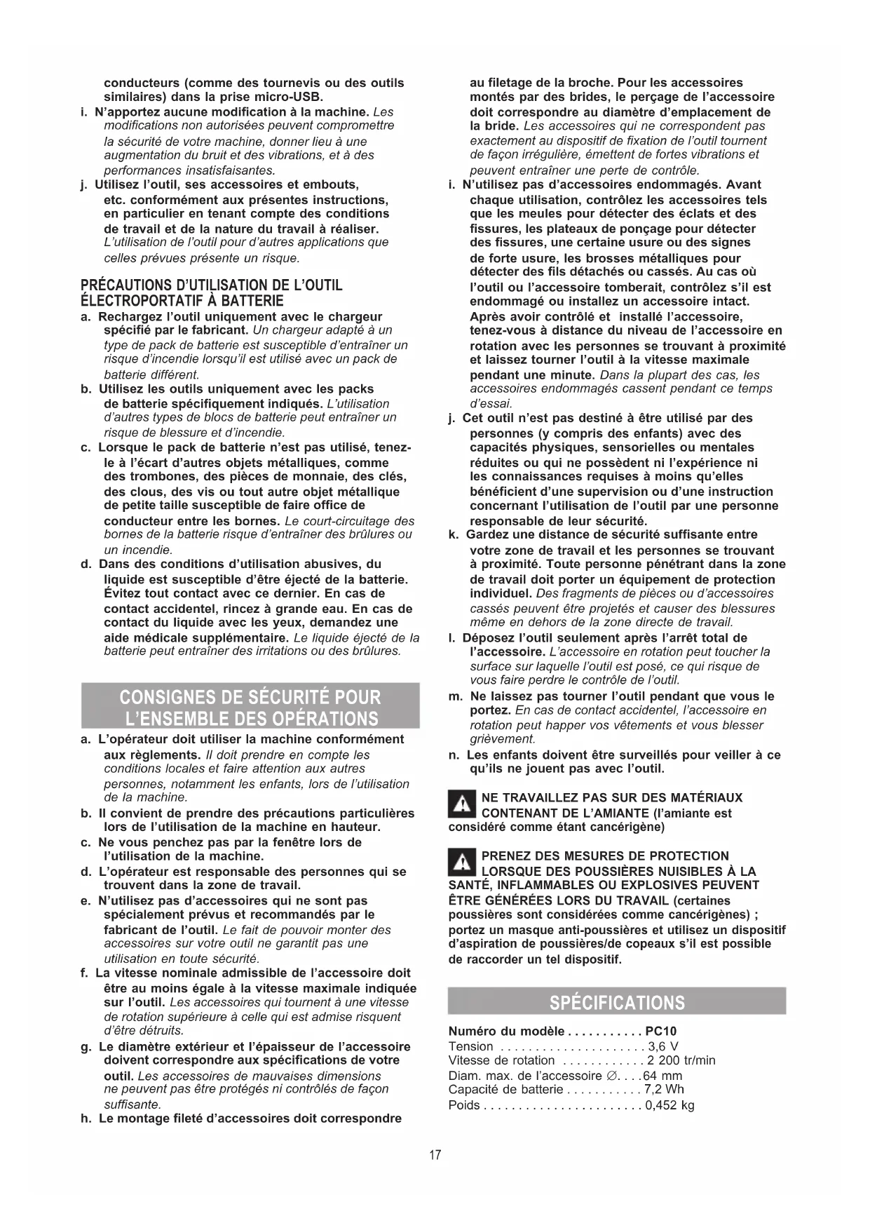 a. Ne forcez pas sur l’outil. Employez l’outil correspondant à votre application. L’outil approprié accomplira sa tâche plus efcacement et plus sûrement s’il est utilisé à la vitesse pour laquelle il a été conçu.b. N’utilisez pas l’outil si l’interrupteur ne fonctionne pas correctement. Un outil dont l’interrupteur est défectueux est dangereux et doit être réparé.c. Les outils doivent être rangés hors de portée des enfants et ne pas être utilisés par des personnes ne connaissant pas leur fonctionnement ou les présentes instructions. Entre les mains d’utilisateurs inexpérimentés, les outils sont dangereux.d. Veillez à bien entretenir les outils. Vériez la présence d’un défaut d’alignement ou grippage des pièces mobiles, de pièces cassées ou de toute autre condition pouvant altérer le fonctionnement de l’outil. Faites réparer l’outil s’il est endommagé avant de l’utiliser. Nombre d’accidents sont provoqués par des outils mal entretenus.e. Si la machine ou des détergents risque de détériorer ou de décolorer une surface, il est recommandé de tester la compatibilité dans une zone peu visible avant utilisation.f. N’utilisez pas d’acides, d’acétone ou de solvants non dilués.g. N’utilisez pas de liquides inammables.h. Évitez de toucher ou d’insérer des objets 16conducteurs (comme des tournevis ou des outils similaires) dans la prise micro-USB.