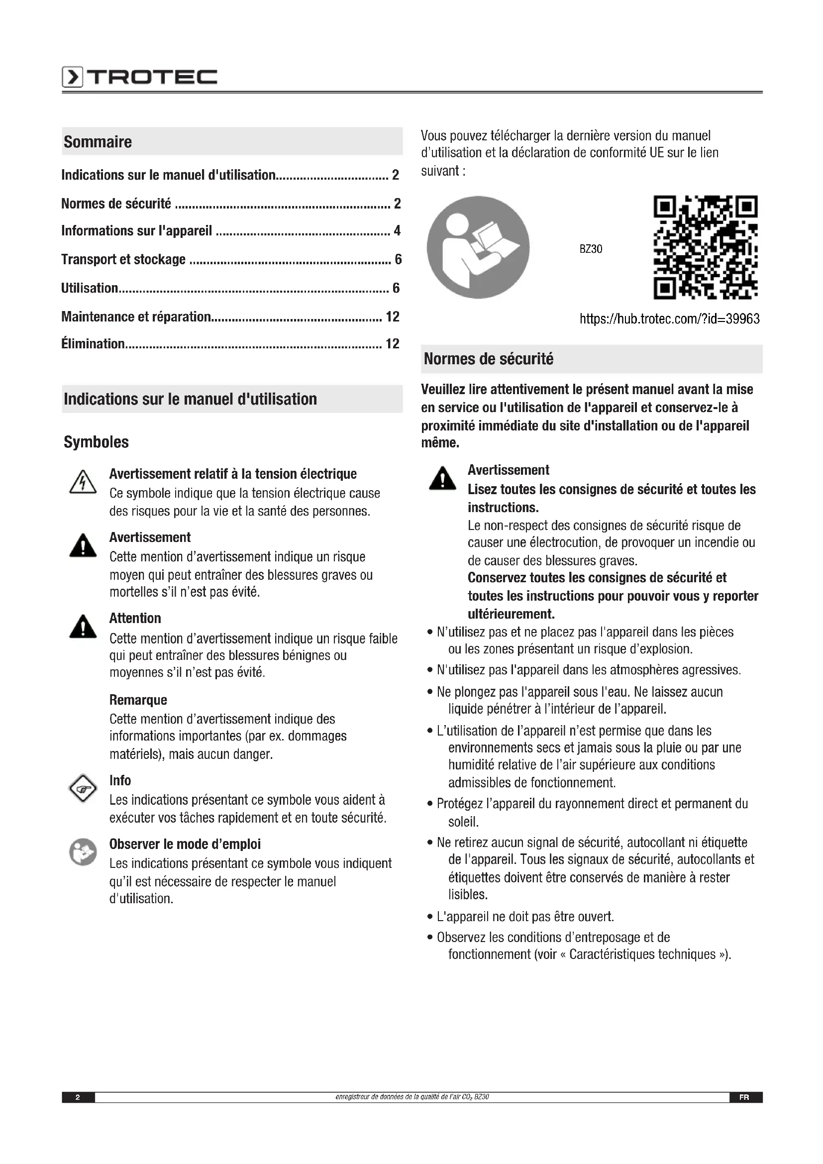, de température et d'humidité relative sont mentionnées. Affichage du résumé des données Cliquez sur le boutonRésumé des données pour visualiser une synthèse de la série de mesures. Maintenance et réparation Charger l’accumulateur La batterie doit être chargée dans le cadre de la première mise en service et lorsque sa puissance faiblit. À cette fin, raccorder le bloc secteur fourni à l’appareil et à une prise de courant. Consultez le chapitre «Utilisation» pour l’insertion de la batterie dans l’appareil. Nettoyage Nettoyez l’appareil avec un chiffon humide, doux et non pelucheux. Veillez à ce qu’aucune humidité ne pénètre dans le boîtier. N’utilisez pas d’aérosol, de solvant, de nettoyant à base d’alcool ni de produit abrasif pour nettoyer l’appareil, mais uniquement un chiffon imbibé d’eau claire. Dépannage Veuillez ne pas modifier l'appareil, ni monter des pièces de rechange. Veuillez vous adresser au fabricant pour faire dépanner ou contrôler l'appareil. Élimination Le pictogramme représentant une poubelle barrée, apposé sur un appareil électrique ou électronique, signifie que celui-ci ne doit pas être éliminé avec les ordures ménagères. Des points de collecte gratuits pour les appareils électriques ou électroniques usagés sont à votre disposition à proximité de chez vous. Les autorités de votre ville ou de votre commune peuvent vous en fournir les adresses. Pour de nombreux pays de l'UE, vous trouverez sur la page Internet https://hub.trotec.com/?id=45090 des informations sur d'autres possibilités de prise en charge. Sinon, adressez-vous à une entreprise homologuée dans votre pays pour le recyclage et l'élimination des appareils électriques usagés. La collecte séparée des appareils électriques et électroniques usagés permet leur réutilisation éventuelle, le recyclage des matériaux constitutifs et les autres formes de recyclage tout en évitant les conséquences négatives pour l’environnement et la santé des produits dangereux qu’ils sont susceptibles de contenir. Li-Ion Les piles usagées et les batteries ne doivent pas être jetées avec les ordures ménagères, mais être éliminées conformément à la directive européenne 2006/66/CE DU PARLEMENT ET DU CONSEIL EUROPEEN du 6 septembre 2006 relative aux piles, aux piles rechargeables, aux accumulateurs et aux batteries. Veuillez éliminer les piles et les batteries conformément aux dispositions légales en vigueur.Trotec GmbH Grebbener Str. 7 D-52525 Heinsberg