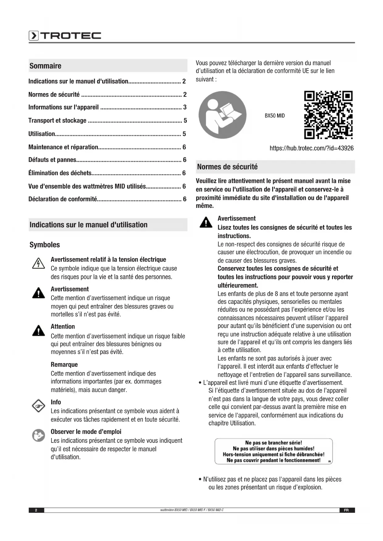 - Déclaration de conformité Indications sur le manuel d'utilisation Symboles Avertissement relatif à la tension électrique Ce symbole indique que la tension électrique cause des risques pour la vie et la santé des personnes. Avertissement Cette mention d’avertissement indique un risque moyen qui peut entraîner des blessures graves ou mortelles s’il n’est pas évité. Attention Cette mention d’avertissement indique un risque faible qui peut entraîner des blessures bénignes ou moyennes s’il n’est pas évité. Remarque Cette mention d’avertissement indique des informations importantes (par ex. dommages matériels), mais aucun danger. Info Les indications présentant ce symbole vous aident à exécuter vos tâches rapidement et en toute sécurité. Observer le mode d’emploi Les indications présentant ce symbole vous indiquent qu’il est nécessaire de respecter le manuel d'utilisation. Vous pouvez télécharger la dernière version du manuel d’utilisation et la déclaration de conformité UE sur le lien suivant: BX50 MID https://hub.trotec.com/?id=43926 Normes de sécurité Veuillez lire attentivement le présent manuel avant la mise en service ou l'utilisation de l'appareil et conservez-le à proximité immédiate du site d'installation ou de l'appareil même. Avertissement Lisez toutes les consignes de sécurité et toutes les instructions. Le non-respect des consignes de sécurité risque de causer une électrocution, de provoquer un incendie ou de causer des blessures graves. Conservez toutes les consignes de sécurité et toutes les instructions pour pouvoir vous y reporter ultérieurement. Les enfants de plus de 8ans et toute personne ayant des capacités physiques, sensorielles ou mentales réduites ou ne possédant pas l'expérience et/ou les connaissances nécessaires peuvent utiliser l'appareil pour autant qu'ils bénéficient d'une supervision ou ont reçu une instruction adéquate relative à une utilisation sure de l'appareil et qu'ils ont compris les dangers liés à cette utilisation. Les enfants ne sont pas autorisés à jouer avec l'appareil. Il est interdit aux enfants d'effectuer le nettoyage et l'entretien de l’appareil sans surveillance. p. 6
