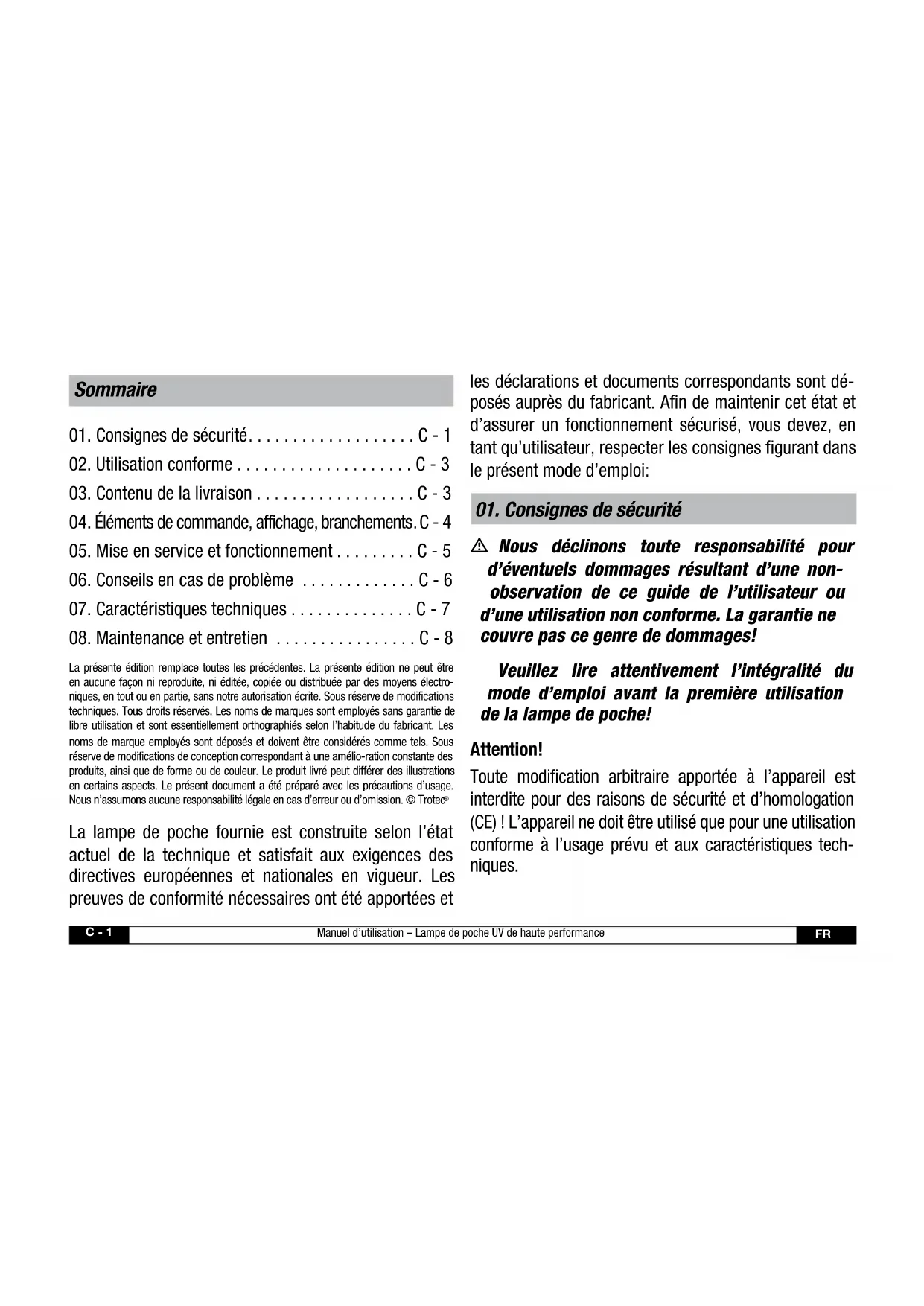 m Nous déclinons toute responsabilité pour d’éventuels dommages résultant d’une non- observation de ce guide de l’utilisateur ou d’une utilisation non conforme. La garantie ne couvre pas ce genre de dommages! Veuillez lire attentivement l’intégralité du mode d’emploi avant la première utilisation de la lampe de poche! Attention! Toute modification arbitraire apportée à l’appareil est interdite pour des raisons de sécurité et d’homologation (CE) ! L’appareil ne doit être utilisé que pour une utilisation conforme à l’usage prévu et aux caractéristiques tech- niques.Manuel d’utilisation – Lampe de poche UV de haute performance C - 2