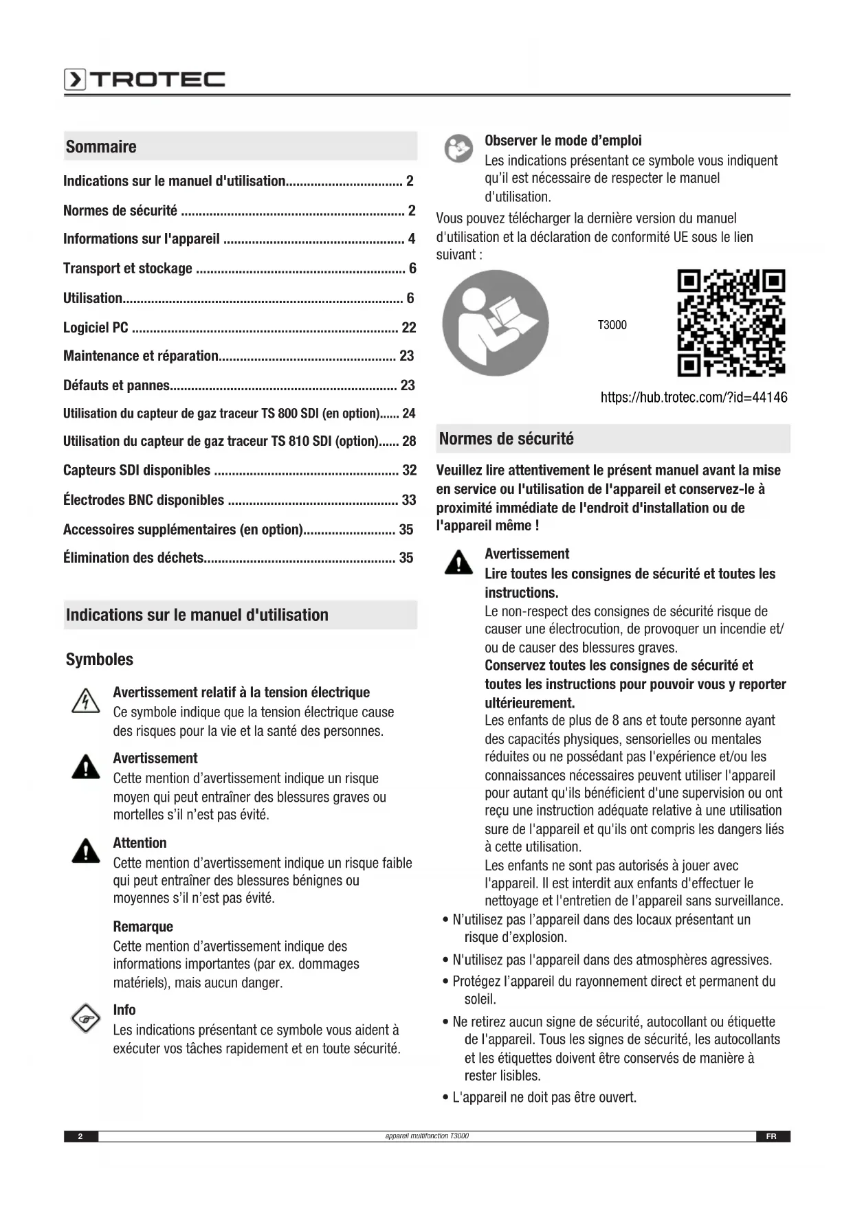 - Élimination des déchets Indications sur le manuel d'utilisation Symboles Avertissement relatif à la tension électrique Ce symbole indique que la tension électrique cause des risques pour la vie et la santé des personnes. Avertissement Cette mention d’avertissement indique un risque moyen qui peut entraîner des blessures graves ou mortelles s’il n’est pas évité. Attention Cette mention d’avertissement indique un risque faible qui peut entraîner des blessures bénignes ou moyennes s’il n’est pas évité. Remarque Cette mention d’avertissement indique des informations importantes (par ex. dommages matériels), mais aucun danger. Info Les indications présentant ce symbole vous aident à exécuter vos tâches rapidement et en toute sécurité. Observer le mode d’emploi Les indications présentant ce symbole vous indiquent qu’il est nécessaire de respecter le manuel d'utilisation. Vous pouvez télécharger la dernière version du manuel d'utilisation et la déclaration de conformité UE sous le lien suivant: T3000 https://hub.trotec.com/?id=44146 Normes de sécurité Veuillez lire attentivement le présent manuel avant la mise en service ou l'utilisation de l'appareil et conservez-le à proximité immédiate de l'endroit d'installation ou de l'appareil même! Avertissement Lire toutes les consignes de sécurité et toutes les instructions. Le non-respect des consignes de sécurité risque de causer une électrocution, de provoquer un incendie et/ ou de causer des blessures graves. Conservez toutes les consignes de sécurité et toutes les instructions pour pouvoir vous y reporter ultérieurement. Les enfants de plus de 8 ans et toute personne ayant des capacités physiques, sensorielles ou mentales réduites ou ne possédant pas l'expérience et/ou les connaissances nécessaires peuvent utiliser l'appareil pour autant qu'ils bénéficient d'une supervision ou ont reçu une instruction adéquate relative à une utilisation sure de l'appareil et qu'ils ont compris les dangers liés à cette utilisation. Les enfants ne sont pas autorisés à jouer avec l'appareil. Il est interdit aux enfants d'effectuer le nettoyage et l'entretien de l’appareil sans surveillance. p. 35