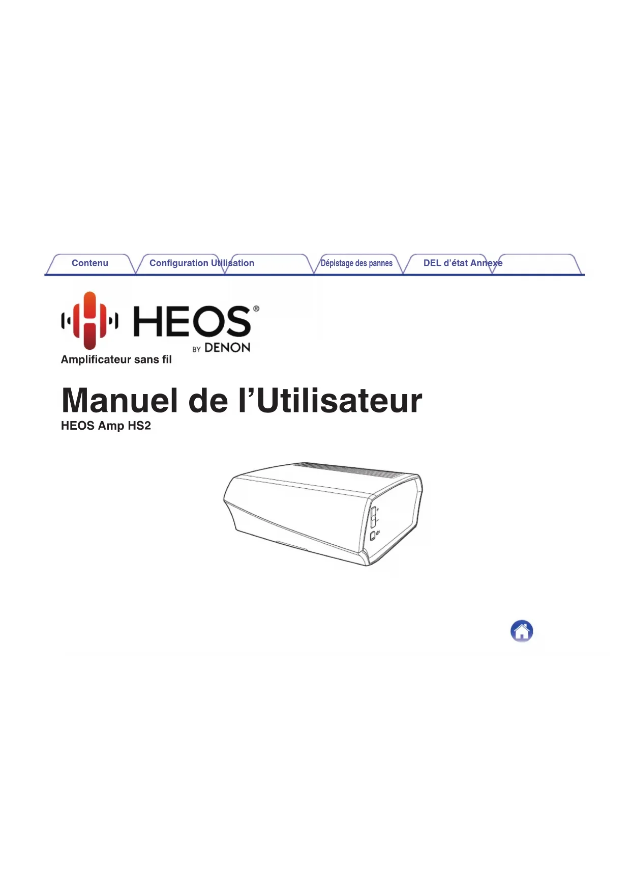 Contenu Configuration Utilisation Dépistage des pannes DEL d’état Annexe 4Nous vous remercions pour l’achat de ce produit HEOS. Pour un fonctionnement optimal, veuillez lire attentivement ce manuel de l’utilisateur avant de vous servir de l’unité. REMARQUE