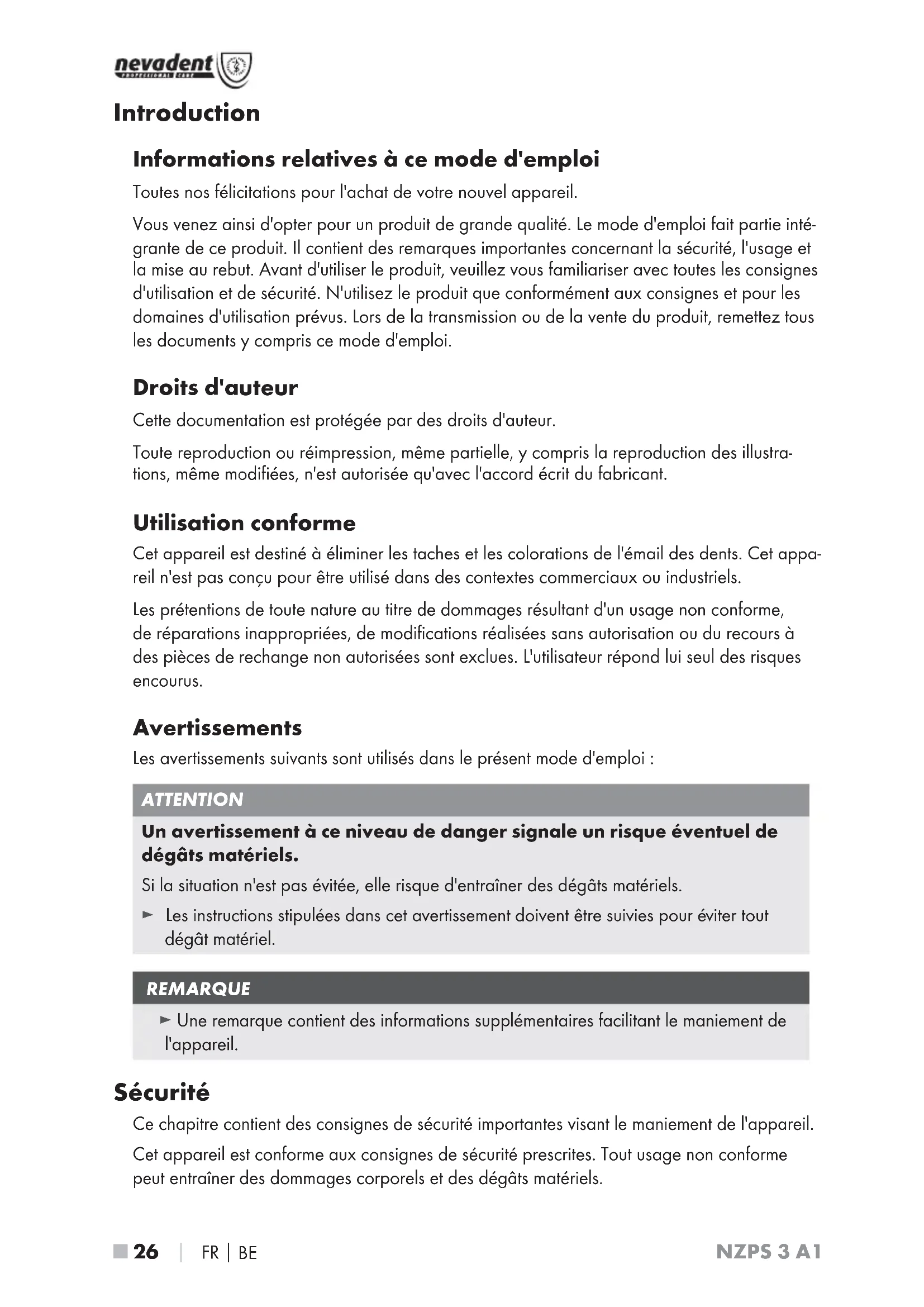 Introduction Informations relatives à ce mode d'emploi Toutes nos félicitations pour l'achat de votre nouvel appareil. Vous venez ainsi d'opter pour un produit de grande qualité. Le mode d'emploi fait partie inté- grante de ce produit. Il contient des remarques importantes concernant la sécurité, l'usage et la mise au rebut. Avant d'utiliser le produit, veuillez vous familiariser avec toutes les consignes d'utilisation et de sécurité. N'utilisez le produit que conformément aux consignes et pour les domaines d'utilisation prévus. Lors de la transmission ou de la vente du produit, remettez tous les documents y compris ce mode d'emploi. Droits d'auteur Cette documentation est protégée par des droits d'auteur. Toute reproduction ou réimpression, même partielle, y compris la reproduction des illustra- tions, même modifiées, n'est autorisée qu'avec l'accord écrit du fabricant. Utilisation conforme Cet appareil est destiné à éliminer les taches et les colorations de l'émail des dents. Cet appa- reil n'est pas conçu pour être utilisé dans des contextes commerciaux ou industriels. Les prétentions de toute nature au titre de dommages résultant d'un usage non conforme, de réparations inappropriées, de modifications réalisées sans autorisation ou du recours à des pièces de rechange non autorisées sont exclues. L'utilisateur répond lui seul des risques encourus. Avertissements Les avertissements suivants sont utilisés dans le présent mode d'emploi: ATTENTION Un avertissement à ce niveau de danger signale un risque éventuel de dégâts matériels. Si la situation n'est pas évitée, elle risque d'entraîner des dégâts matériels. ► Les instructions stipulées dans cet avertissement doivent être suivies pour éviter tout dégât matériel. REMARQUE ► Une remarque contient des informations supplémentaires facilitant le maniement de l'appareil. Sécurité Ce chapitre contient des consignes de sécurité importantes visant le maniement de l'appareil. Cet appareil est conforme aux consignes de sécurité prescrites. Tout usage non conforme peut entraîner des dommages corporels et des dégâts matériels.NZPS 3 A1