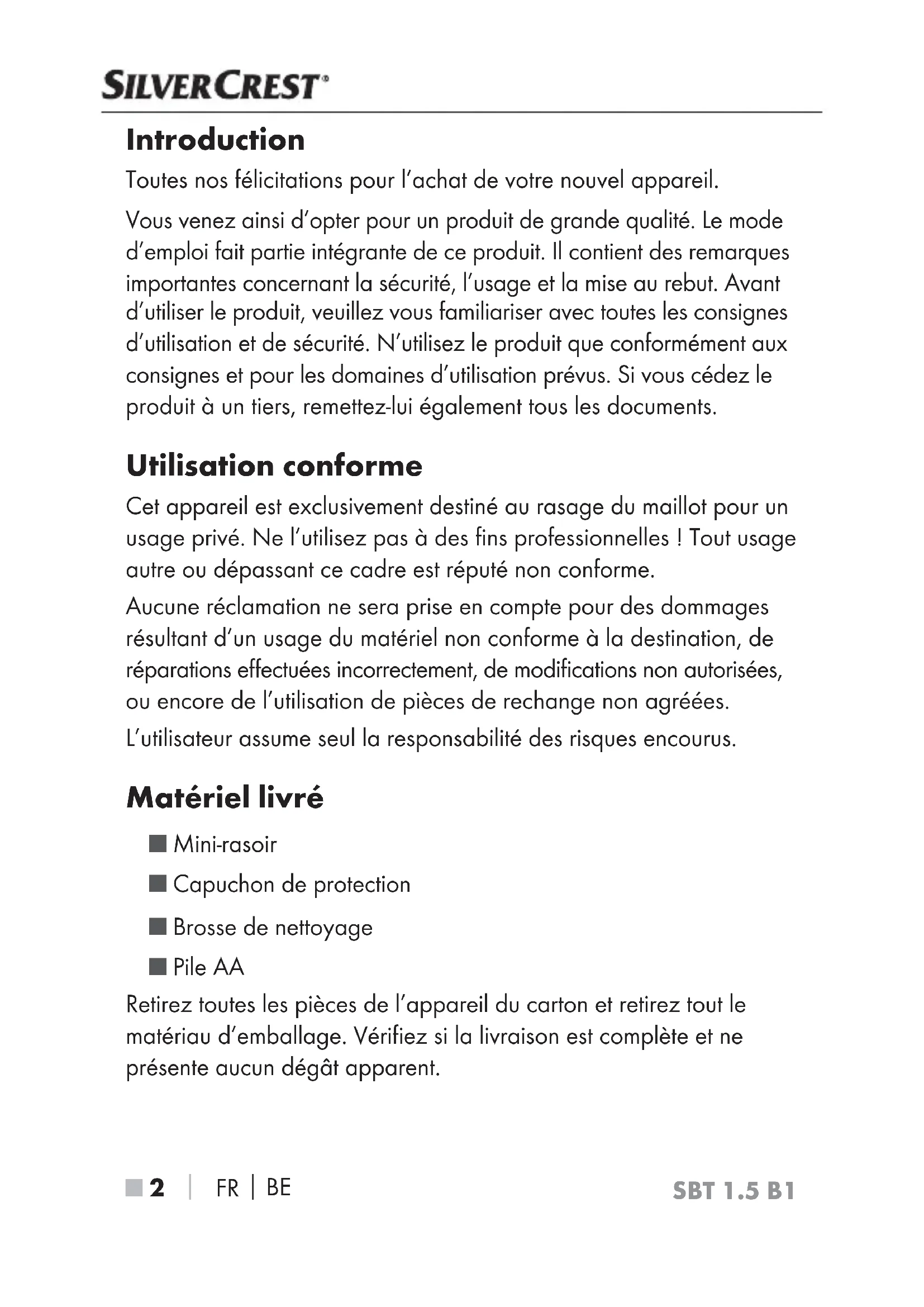 Introduction Toutes nos félicitations pour l’achat de votre nouvel appareil. Vous venez ainsi d’opter pour un produit de grande qualité. Le mode d’emploi fait partie intégrante de ce produit. Il contient des remarques importantes concernant la sécurité, l’usage et la mise au rebut. Avant d’utiliser le produit, veuillez vous familiariser avec toutes les consignes d’utilisation et de sécurité. N’utilisez le produit que conformément aux consignes et pour les domaines d’utilisation prévus. Si vous cédez le produit à un tiers, remettez-lui également tous les documents. Utilisation conforme Cet appareil est exclusivement destiné au rasage du maillot pour un usage privé. Ne l’utilisez pas à des fins professionnelles! Tout usage autre ou dépassant ce cadre est réputé non conforme. Aucune réclamation ne sera prise en compte pour des dommages résultant d’un usage du matériel non conforme à la destination, de réparations effectuées incorrectement, de modifications non autorisées, ou encore de l’utilisation de pièces de rechange non agréées. L’utilisateur assume seul la responsabilité des risques encourus. Matériel livré ■ Mini-rasoir ■ Capuchon de protection ■ Brosse de nettoyage ■ Pile AA Retirez toutes les pièces de l’appareil du carton et retirez tout le matériau d’emballage. Vérifiez si la livraison est complète et ne présente aucun dégât apparent.SBT 1.5 B1