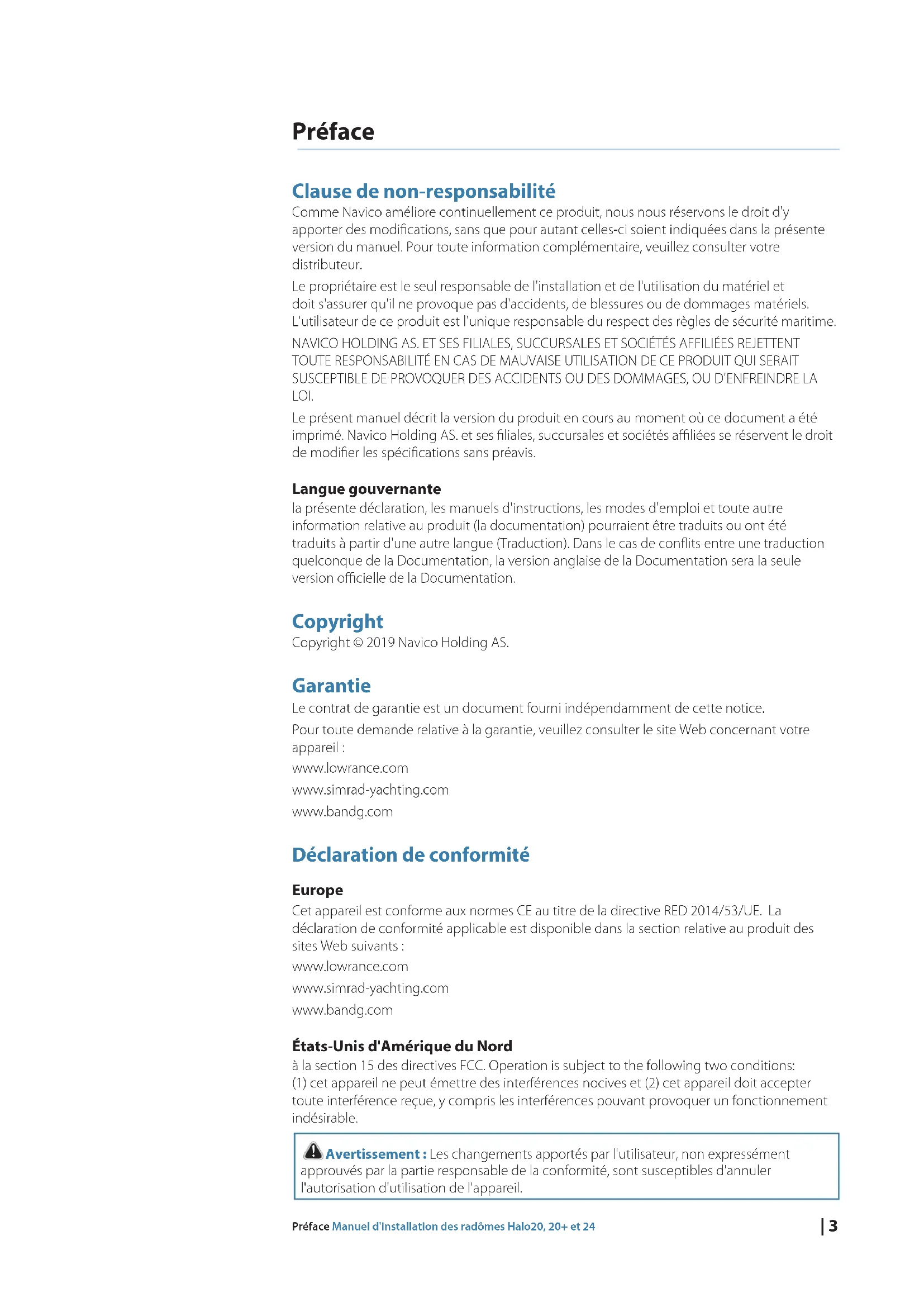 FRANÇAIS Radômes Halo20, 20+ et24 Manuel d'installation www.lowrance.com www.simrad-yachting.com www.bandg.com| 3 Préface Manuel d'installation des radômes Halo20, 20+ et24 Préface Clause de non-responsabilité Comme Navico améliore continuellement ce produit, nous nous réservons le droit d'y apporter des modifications, sans que pour autant celles-ci soient indiquées dans la présente version du manuel. Pour toute information complémentaire, veuillez consulter votre distributeur.Le propriétaire est le seul responsable de l'installation et de l'utilisation du matériel et doit s'assurer qu'il ne provoque pas d'accidents, de blessures ou de dommages matériels. L'utilisateur de ce produit est l'unique responsable du respect des règles de sécurité maritime.NAVICO HOLDING AS. ET SES FILIALES, SUCCURSALES ET SOCIÉTÉS AFFILIÉES REJETTENT TOUTE RESPONSABILITÉ EN CAS DE MAUVAISE UTILISATION DE CE PRODUIT QUI SERAIT SUSCEPTIBLE DE PROVOQUER DES ACCIDENTS OU DES DOMMAGES, OU D'ENFREINDRE LA LOI. Le présent manuel décrit la version du produit en cours au moment où ce document a été imprimé. Navico Holding AS. et ses filiales, succursales et sociétés affiliées se réservent le droit de modifier les spécifications sans préavis. Langue gouvernante la présente déclaration, les manuels d'instructions, les modes d'emploi et toute autre information relative au produit (la documentation) pourraient être traduits ou ont été traduits à partir d'une autre langue (Traduction). Dans le cas de conflits entre une traduction quelconque de la Documentation, la version anglaise de la Documentation sera la seule version officielle de la Documentation. Copyright Copyright © 2019 Navico Holding AS. Garantie Le contrat de garantie est un document fourni indépendamment de cette notice.Pour toute demande relative à la garantie, veuillez consulter le site Web concernant votre appareil :www.lowrance.comwww.simrad-yachting.comwww.bandg.com Déclaration de conformité Europe Cet appareil est conforme aux normes CE au titre de la directive RED 2014/53/UE. La déclaration de conformité applicable est disponible dans la section relative au produit des sites Web suivants : www.lowrance.comwww.simrad-yachting.comwww.bandg.com États-Unis d'Amérique du Nord à la section 15 des directives FCC. Operation is subject to the following two conditions: (1) cet appareil ne peut émettre des interférences nocives et (2) cet appareil doit accepter toute interférence reçue, y compris les interférences pouvant provoquer un fonctionnement indésirable.