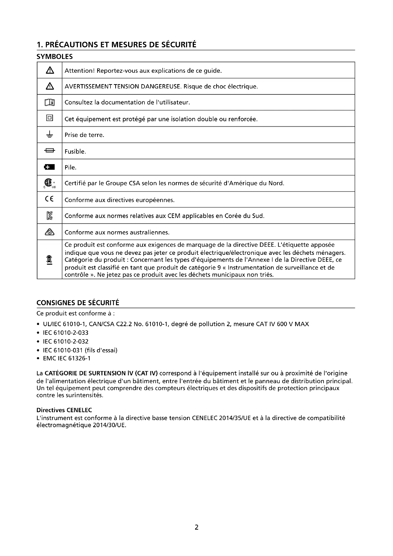 - EMC IEC 61326-1 La CATÉGORIE DE SURTENSION lV (CAT IV) correspond à l'équipement installé sur ou à proximité de l'origine de l'alimentation électrique d'un bâtiment, entre l'entrée du bâtiment et le panneau de distribution principal. Un tel équipement peut comprendre des compteurs électriques et des dispositifs de protection principaux contre les surintensités. Directives CENELEC L'instrument est conforme à la directive basse tension CENELEC 2014/35/UE et à la directive de compatibilité électromagnétique 2014/30/UE.3 Avertissements: Lire avant utilisation Pour éviter la possibilité d'une électrocution ou d'une blessure: