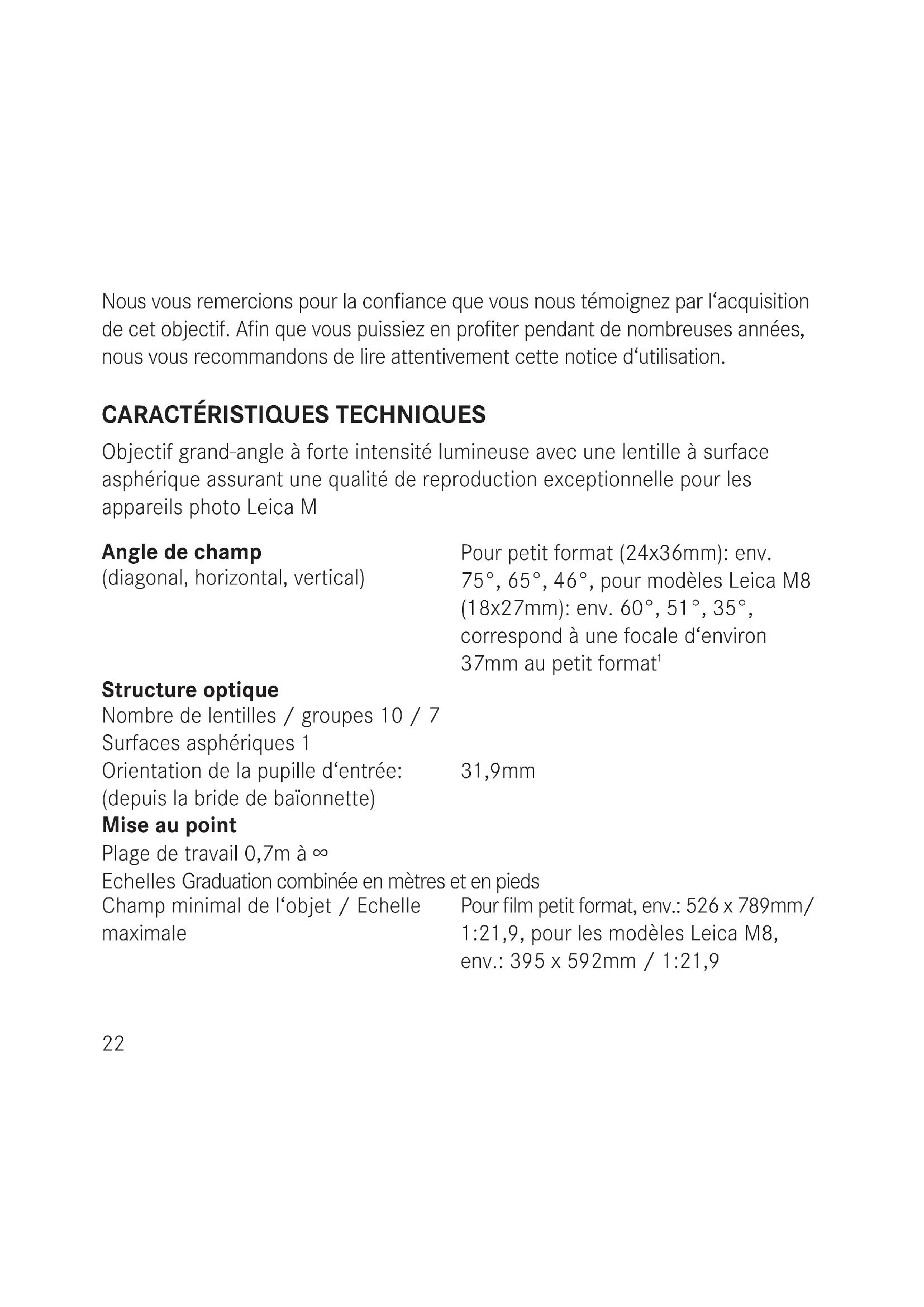 Structure optique Nombre de lentilles / groupes 10 / 7 Surfaces asphériques 1 Orientation de la pupille d‘entrée: (depuis la bride de baïonnette) 31,9mm Mise au point Plage de travail 0,7m à ∞ Echelles Graduation combinée en mètres et en pieds Champ minimal de l‘objet / Echelle maximale Pour film petit format, env.: 526 x 789mm/ 1:21,9, pour les modèles Leica M8, env.: 395 x 592mm / 1:21,9