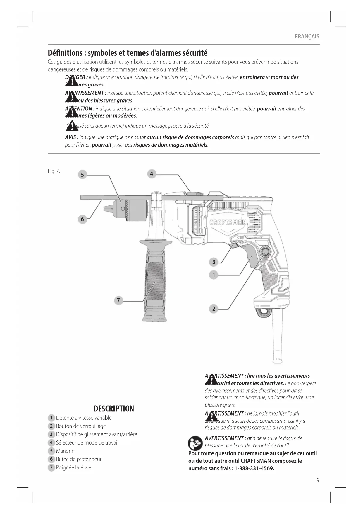 blessures, lire le mode d’emploi del’outil. Pour toute question ou remarque au sujet de cet outil ou de tout autre outil CRAFTSMAN composez le numéro sans frais : 1-888-331-4569.