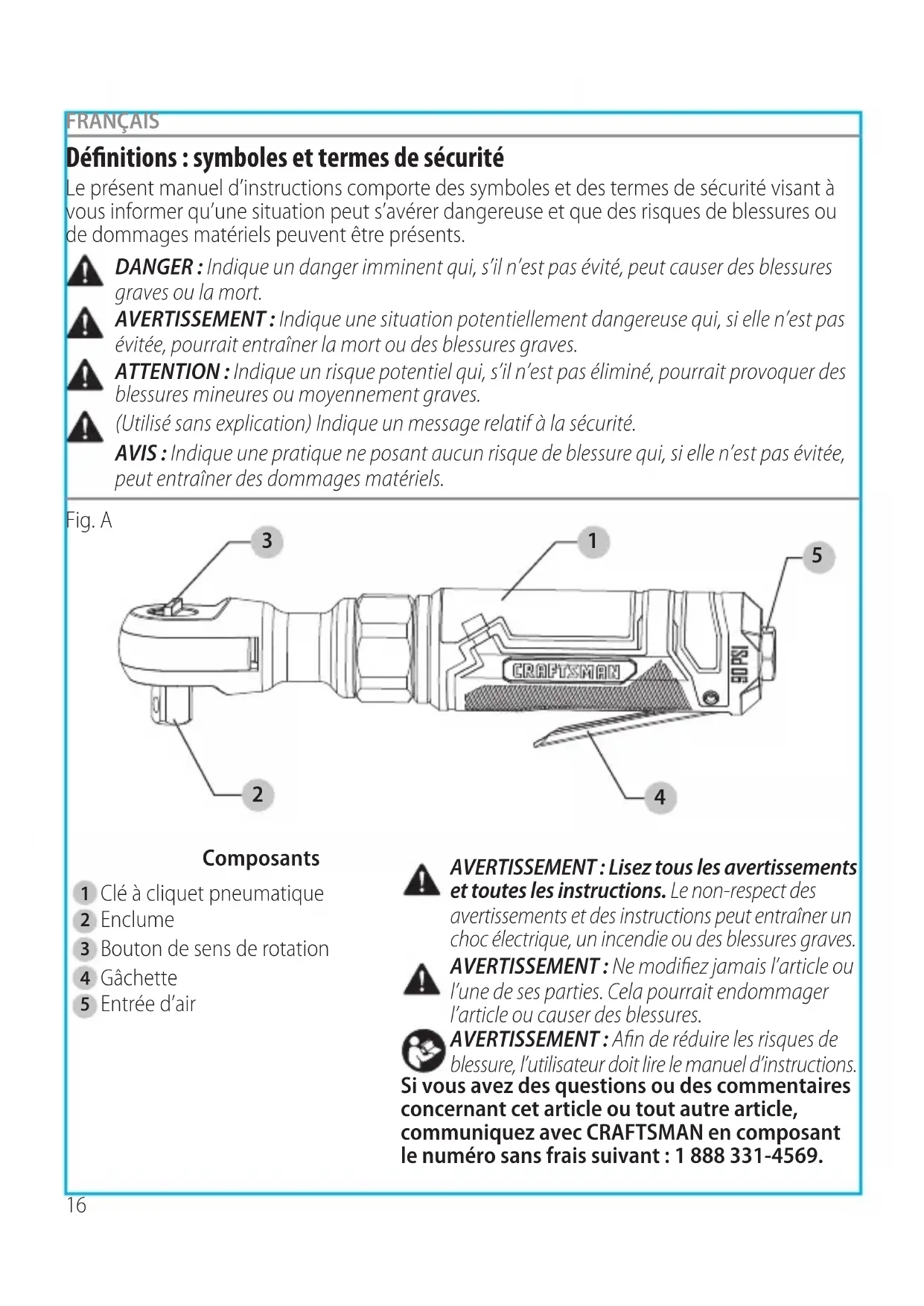 blessure, l’utilisateur doit lire le manuel d’instructions. Si vous avez des questions ou des commentaires concernant cet article ou tout autre article, communiquez avec CRAFTSMAN en composant le numéro sans frais suivant : 1 888 331-4569.Caractéristiques techniques