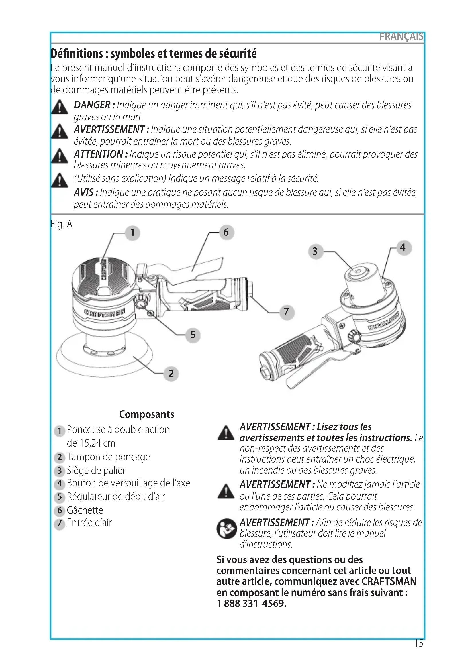 blessure, l’utilisateur doit lire le manuel d’instructions. Si vous avez des questions ou des commentaires concernant cet article ou tout autre article, communiquez avec CRAFTSMAN en composant le numéro sans frais suivant : 1 888 331-4569.Caractéristiques techniques Modèle CMXPTSG1014NB Tampon de ponçage 152,4 mm (6 po) Vitesse libre 10 000 tours/minute Consommation d’air moyenne 5,2 pi³/min standard Entrée d’air 1/4 po, NPT Tuyau à air 9,52 mm (3/8 po) Pression de service 90 lb/po² Ponceuse à double action de 15,24 cm