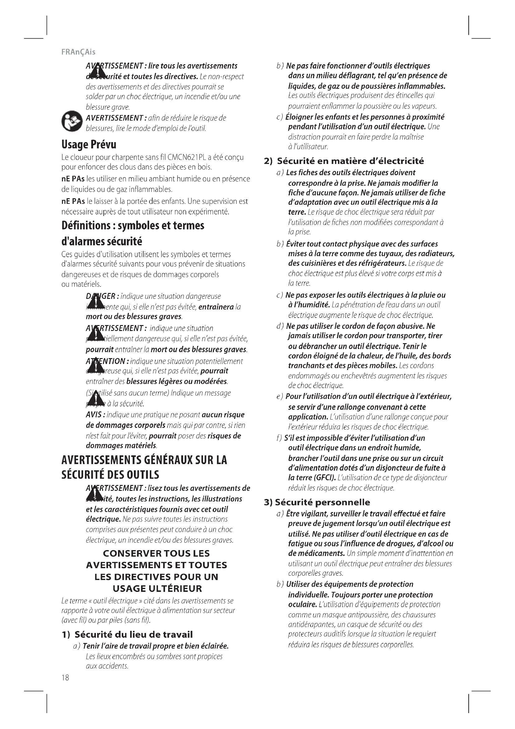 (Si utilisé sans aucun terme) Indique un message propre à lasécurité. AVIS : indique une pratique ne posant aucun risque de dommages corporels mais qui par contre, si rien n’est fait pour l’éviter, pourrait poser des risques de dommagesmatériels. Usage Prévu Le cloueur pour charpente sans fil CMCN621PL a été conçu pour enfoncer des clous dans des pièces enbois. nE PAs les utiliser en milieu ambiant humide ou en présence de liquides ou de gazinflammables. nE PAs le laisser à la portée des enfants. Une supervision est nécessaire auprès de tout utilisateur nonexpérimenté.FRAnçAis
