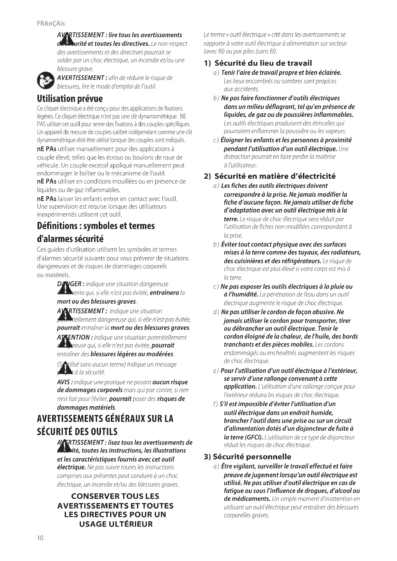 blessures, lire le mode d’emploi del’outil.FRAnçAis
