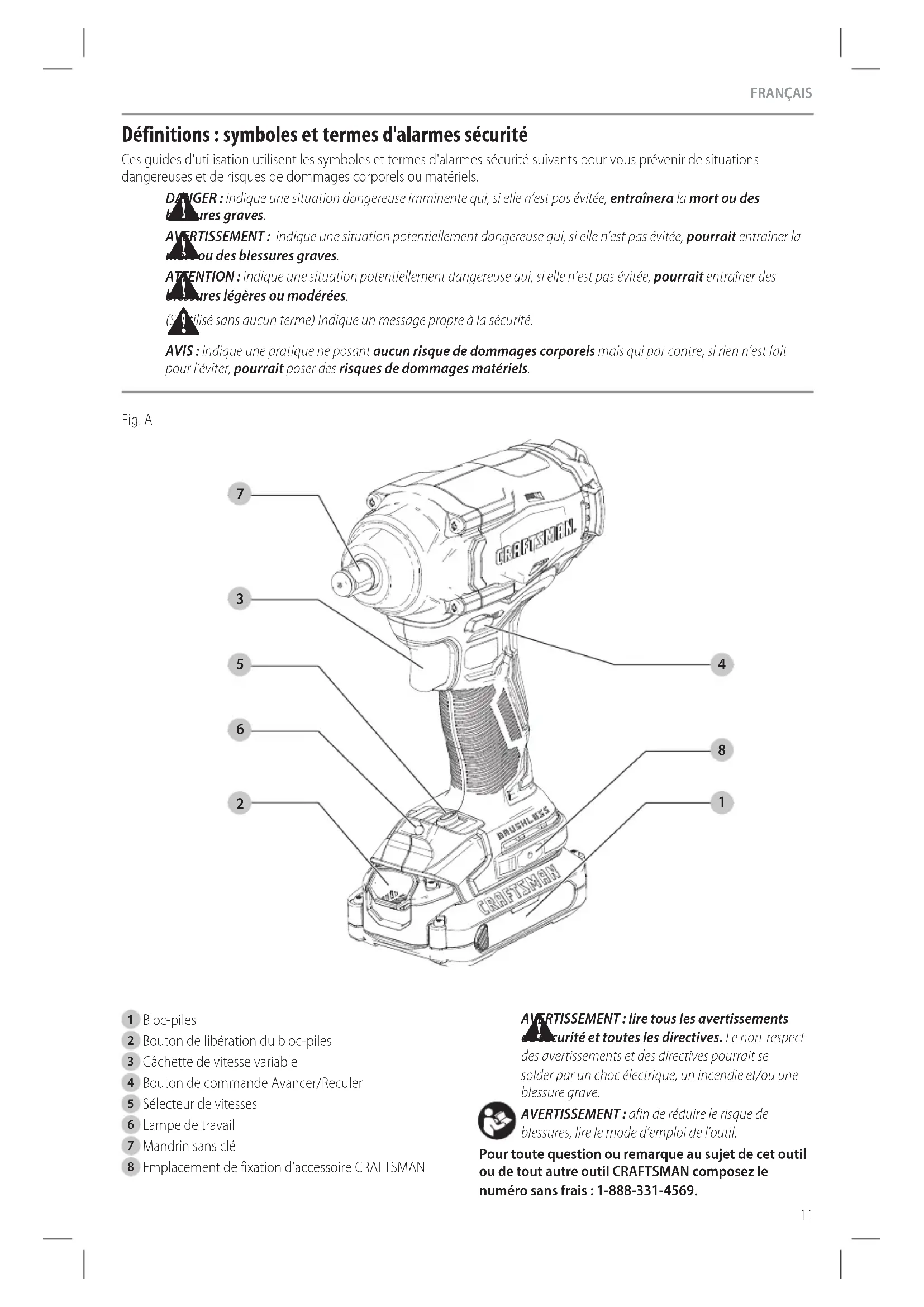 blessures, lire le mode d’emploi del’outil. Pour toute question ou remarque au sujet de cet outil ou de tout autre outil CRAFTSMAN composez le numéro sans frais : 1-888-331-4569.