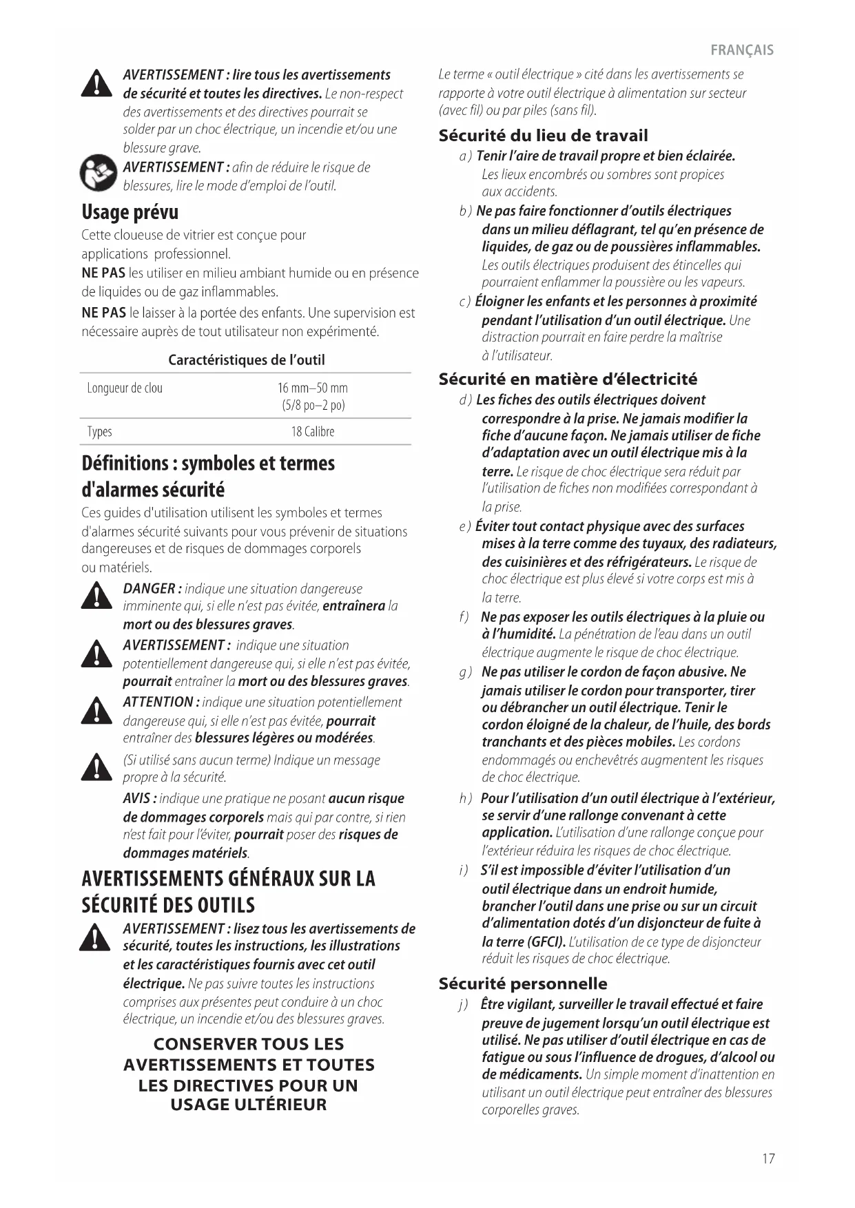 blessures, lire le mode d’emploi del’outil. Usage prévu Cette cloueuse de vitrier est conçue pour applicationsprofessionnel. NE PAS les utiliser en milieu ambiant humide ou en présence de liquides ou de gazinflammables. NE PAS le laisser à la portée des enfants. Une supervision est nécessaire auprès de tout utilisateur nonexpérimenté. Caractéristiques de l’outil Longueur de clou 16 mm–50 mm (5/8 po–2 po) Types 18 Calibre Components Tool Use cloueuse de vitrier professionnelFRAnçAis