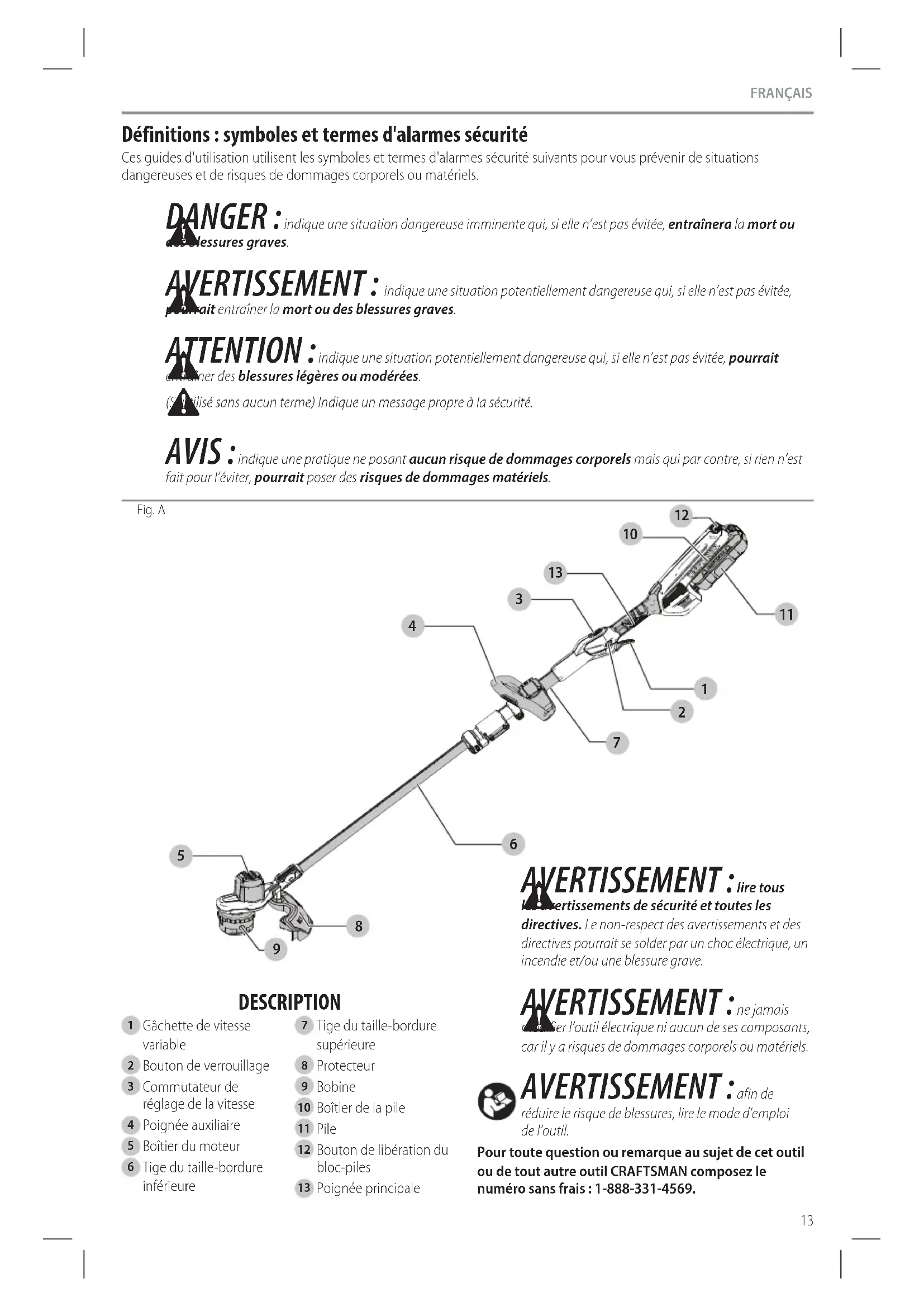 réduire le risque de blessures, lire le mode d’emploi del’outil. Pour toute question ou remarque au sujet de cet outil ou de tout autre outil CRAFTSMAN composez le numéro sans frais : 1-888-331-4569. DESCRIPTION