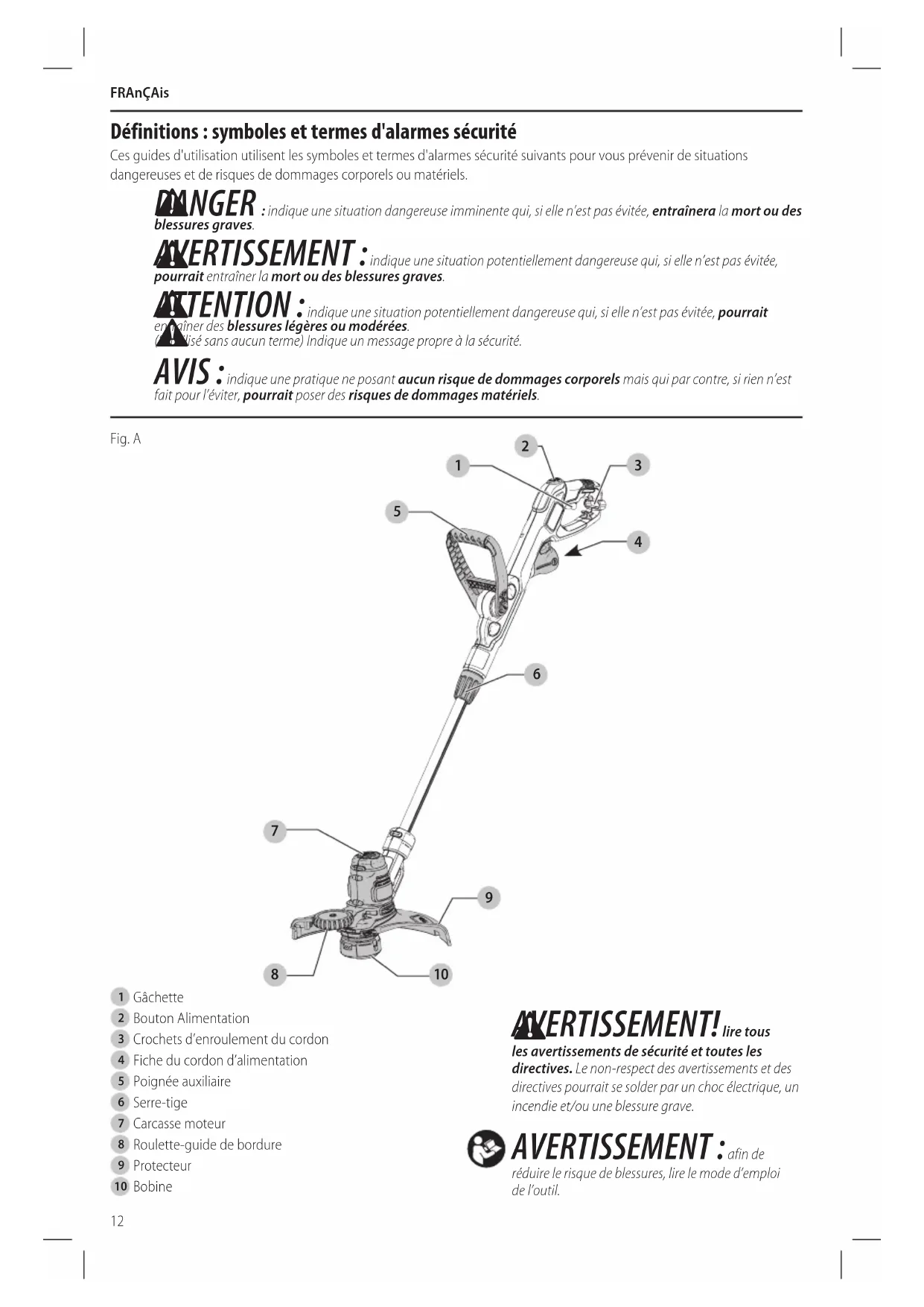 AVERTISSEMENT! lire tous les avertissements de sécurité et toutes les directives. Le non-respect des avertissements et des directives pourrait se solder par un choc électrique, un incendie et/ou une blessuregrave.