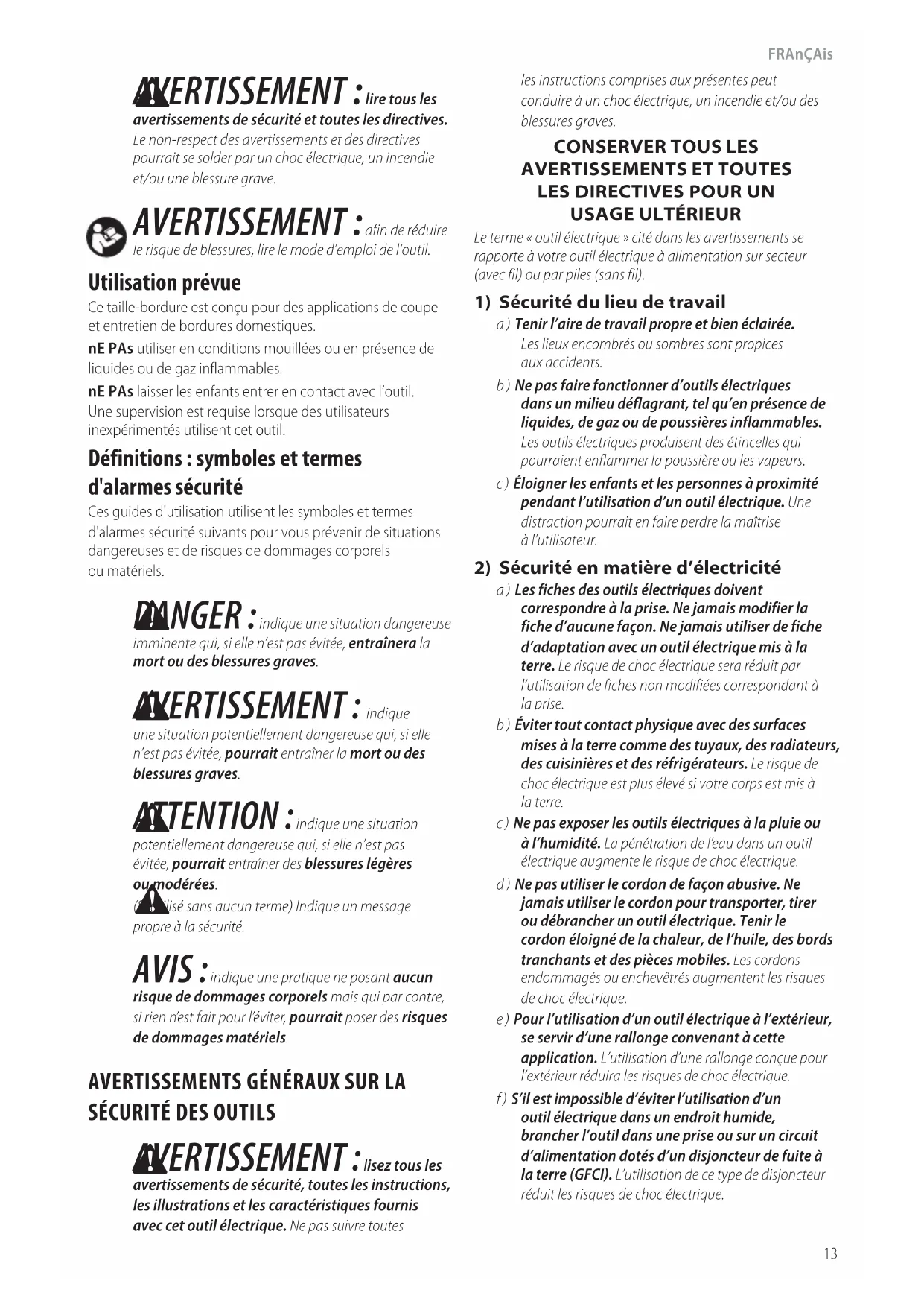 (Si utilisé sans aucun terme) Indique un message propre à lasécurité. AVIS : indique une pratique ne posant aucun risque de dommages corporels mais qui par contre, si rien n’est fait pour l’éviter, pourrait poser des risques de dommagesmatériels. Utilisation prévue Ce taille-bordure est conçu pour des applications de coupe et entretien de borduresdomestiques. nE PAs utiliser en conditions mouillées ou en présence de liquides ou de gazinflammables. nE PAs laisser les enfants entrer en contact avec l’outil. Une supervision est requise lorsque des utilisateurs inexpérimentés utilisent cetoutil. Français (traduction de la notice d’instructions originale)
