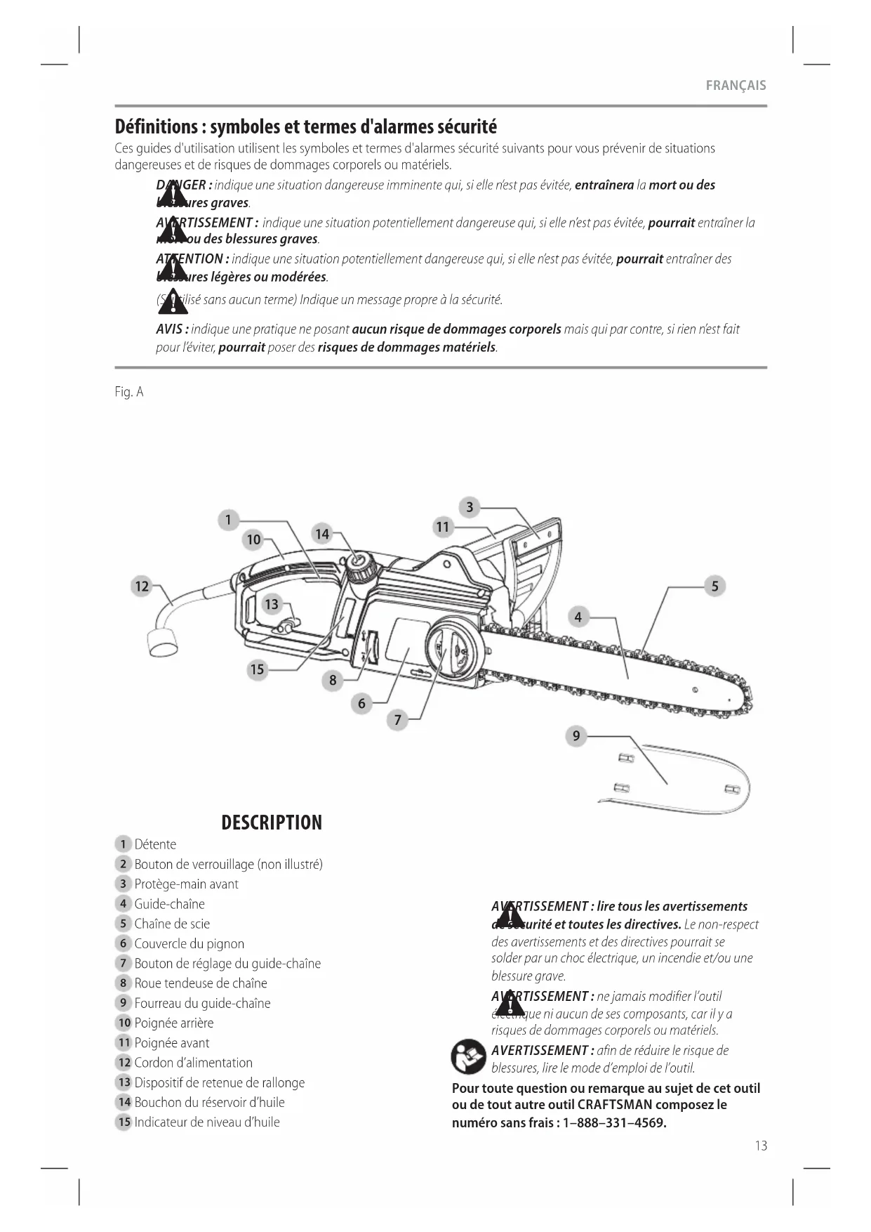 blessures, lire le mode d’emploi del’outil. Pour toute question ou remarque au sujet de cet outil ou de tout autre outil CRAFTSMAN composez le numéro sans frais : 1–888–331–4569. Français (traduction de la notice d’instructions originale) DESCRIPTION