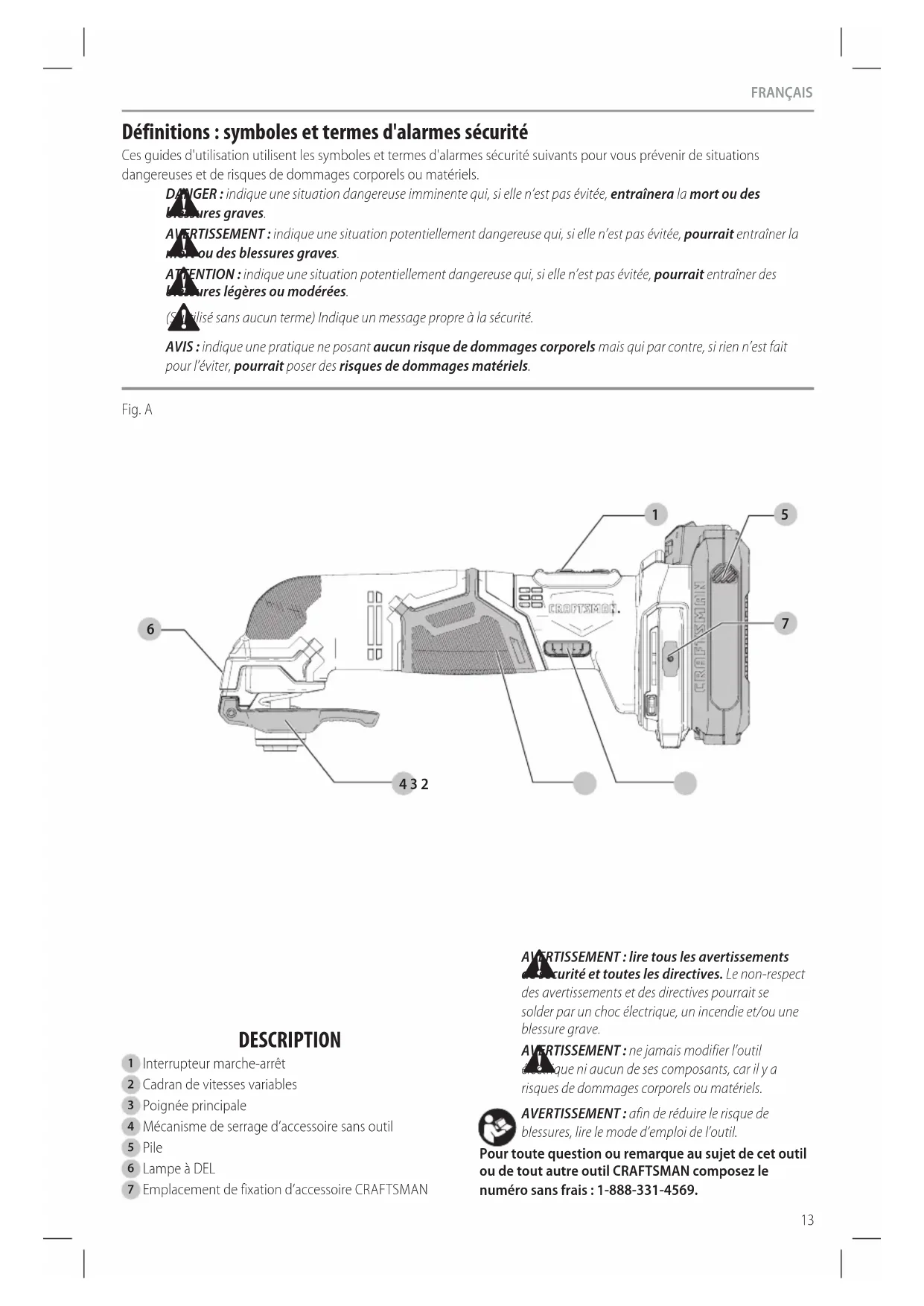 blessures, lire le mode d’emploi del’outil. Pour toute question ou remarque au sujet de cet outil ou de tout autre outil CRAFTSMAN composez le numéro sans frais : 1-888-331-4569.