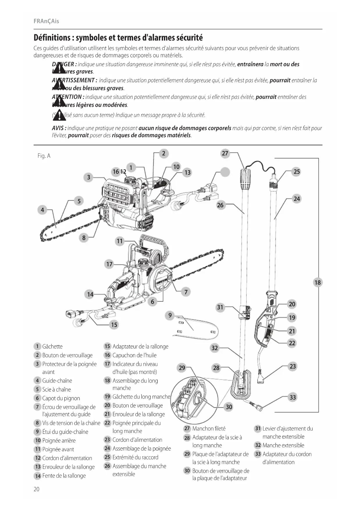 de blessure corporelle, éteignez l’outil et débranchez-le de la source d’alimentation avant d’effectuer tout ajustement ou de retirer/ installer des pièces ou des accessoires. Un démarrage accidentel peut causer desblessures. Détacher la scie à chaîne et l’assemblage du manche extensible (Fig.X–AA)