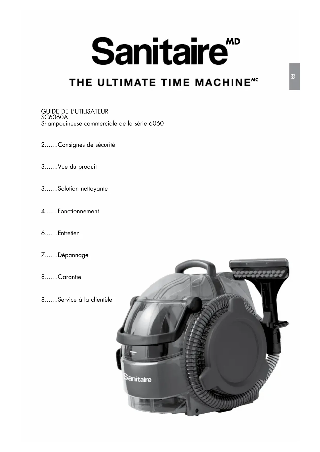 CETTE GARANTIE EST EXCLUSIVE ET REMPLACE TOUTE AUTRE GARANTIE, VERBALE OU ÉCRITE. TOUTES LES GARANTIES IMPLICITES POUVANT RÉSULTER DE L’APPLICATION D’UNE LOI, Y COMPRIS LES GARANTIES IMPLICITES DE QUALITÉ MARCHANDE ET DE CONVENANCE À UN USAGE PARTICULIER, SONT LIMITÉES À LA DURÉE D’UN AN À COMPTER DE LA DATE D’ACHAT, TEL QUE STIPULÉ CI-DESSUS. Certains États ou certaines provinces ne permettant pas de limiter la durée des garanties implicites, il se peut donc que les limitations indiquées ci-dessus ne s’appliquent pas à votre situation. Garantie REMARQUE : Veuillez conserver votre reçu de vente originale. Il servira de preuve de la date d’achat si vous devez faire une réclamation au titre de la garantie. Service à la clientèle de Sanitaire Si votre produit Sanitaire doit être réparé : Consultez le site sanitairecommercial.com, sous la rubrique des emplacements des centres de service, ou communiquez avec le service à la clientèle de Sanitaire pour connaître l’emplacement du centre de service agréé le plus près de chez vous. Si vous avez besoin d’information sur les réparations ou les pièces de rechange ou si vous avez des questions au sujet de la garantie de votre appareil, communiquez avec : Service à la clientèle de Sanitaire 1-800-800-8975 Lundi au vendredi de 9 h à 20 h 30 HNE Ou consultez le site Web de Sanitaire : www.sanitairecommercial.com Lorsque vous communiquez avec Sanitaire, ayez en main le numéro de modèle de l’appareil. Inscrivez le numéro de modèle ici : _______________________ Inscrivez la date d’achat ici : _______________________ REMARQUE : Veuillez conserver votre reçu de vente original. Il servira de preuve de la date d’achat si vous devez faire une réclamation au titre de la garantie. Consultez la page Garantie pour plus de détails. ©2019 BISSELL Homecare, IncNuméro de pièce: 161-8136 11/18 RevCwww.sanitairecommercial.com
