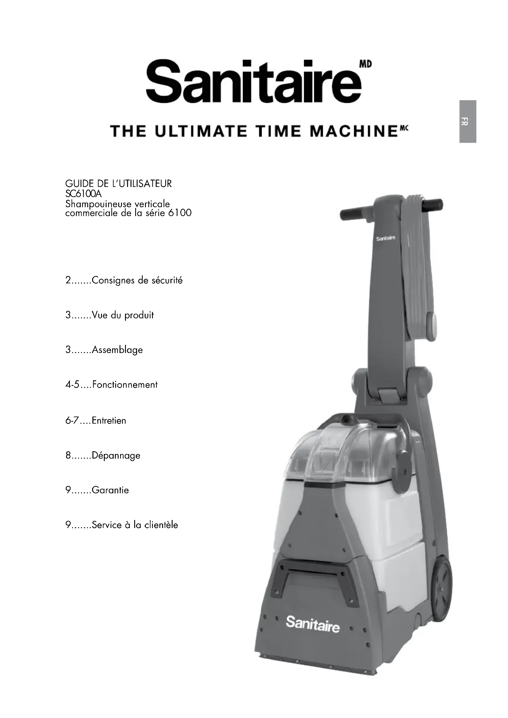 Garantie Service à la clientèle Si votre produit Sanitaire doit être réparé : Consultez le site sanitairecommercial.com, sous la rubrique des emplacements des centres de service, ou communiquez avec le service à la clientèle de Sanitaire. Si vous avez besoin d’information sur les réparations ou les pièces de rechange ou si vous avez des questions au sujet de la garantie de votre appareil, communiquez avec le service à la clientèle de Sanitaire. Cette garantie vous confère des droits précis. Il est possible que vous disposiez également d’autres droits, qui varient d’un État ou d’une province à l’autre. Si vous avez besoin de directives supplémentaires relatives à cette garantie ou si vous avez des questions au sujet de ce qu’elle couvre, veuillez communiquer avec le service à la clientèle de SanitaireMD par courriel, par téléphone ou par la poste de la manière décrite ci-dessous. Garantie limitée d’un an Sous réserve des *EXCEPTIONS ET EXCLUSIONS stipulées ci-dessous et à la réception du produit, Sanitaire s’engage pendant un an à compter de la date d’achat par l’acheteur initial à réparer ou à remplacer (par des pièces ou des produits neufs, remis à neuf, légèrement usés ou réusinés), à sa discrétion et sans frais, toute pièce défectueuse ou défaillante. Reportez-vous à la section intitulée « Si votre produit Sanitaire doit être réparé » ci-dessous. La présente garantie ne s’applique pas aux ventilateurs ni aux pièces d’entretien de routine telles que les filtres, les courroies et les brosses. Les dommages et défaillances causés par de la négligence, un usage abusif, une réparation non autorisée ou tout autre motif non conforme au guide de l’utilisateur ne sont pas couverts. Certains États ou certaines provinces ne permettent pas les exclusions ou les limitations quant aux dommages accessoires ou consécutifs, de sorte que les exclusions ou limitations indiquées ci-dessus peuvent ne pas s’appliquer à vous.