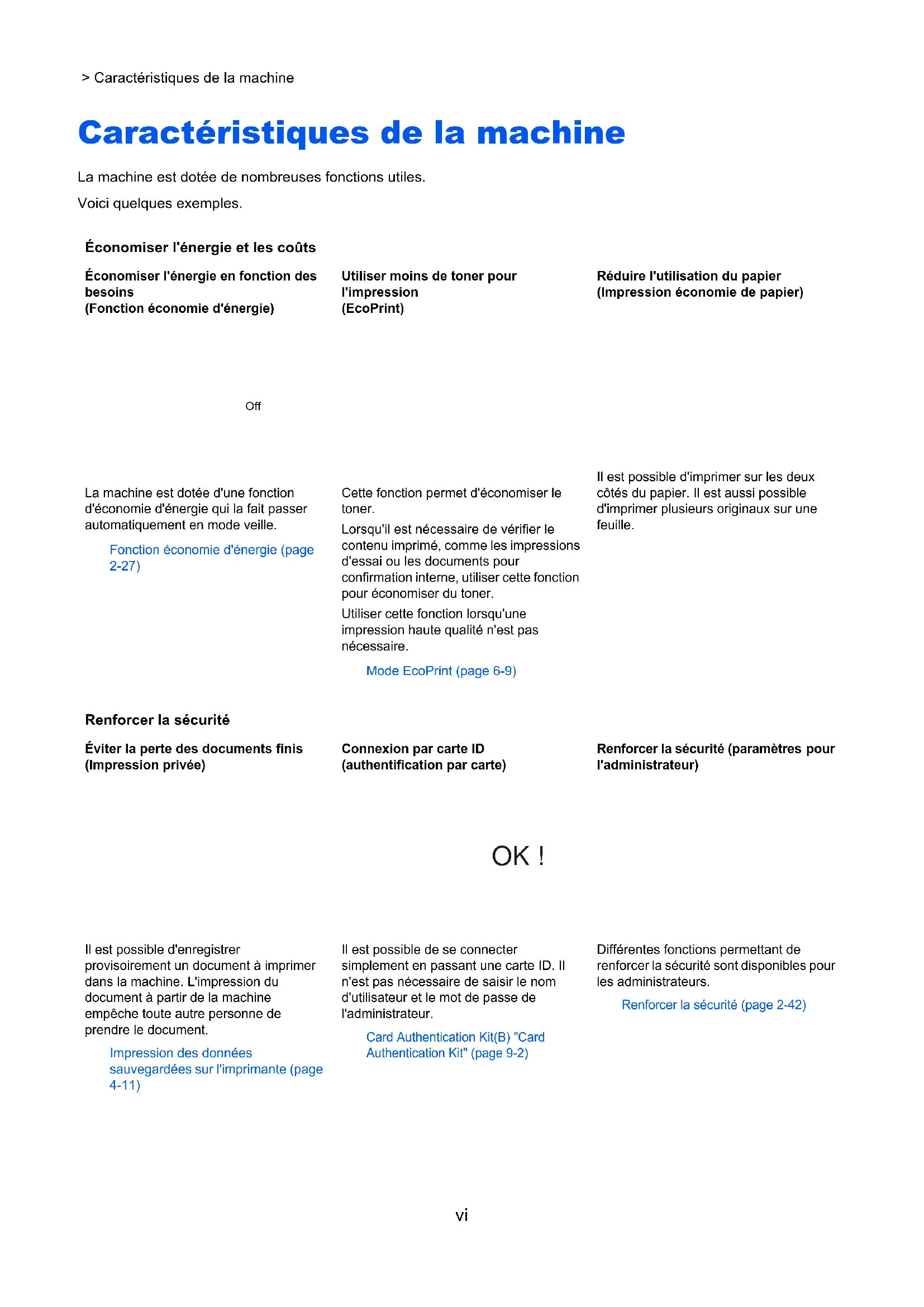 Réseau (page 6-20) Lecteur de carte (page 6-20) Règle d'arrêt Réseau (page 6-21) Câble USB (page 6-21) Hôte USB (page 6-21) Disque RAM (page 6-21) Tempo. arrêt (page 6-21) Aff. état/journ. Détails travaux (page 6-21) Journal travaux (page 6-21) Alerte toner bas (page 6-22) Sécurité Blocage de l'interface Hôte USB (page 6-23) Périphérique USB (page 6-23) Stockage USB (page 6-23) Niveau de sécurité (page 6-23)xvi > Plan du menu NomUtil/CptaTrav ParamLogin util Type login (page 7-3) Connexion à clé (page 7-4) Compta. travaux (page 7-7) Accès compta (page 7-8) Sélection Compte Compteur (page 7-17) Compteur couleur (page 7-17) Restriction (page 7-11) Restriction couleur (page 7-11) Sortie max (page 7-11) Nombre couleur max (page 7-11) Réinitialiser compt (page 7-17) Ajout. compteur (page 7-9) Suppr. compte (page 7-14) Imprimer liste gestion travaux (page 7-17) Appl/ restrict. (page 7-20) ID trav. inconnu (page 7-21) Administrateur Changer ID (page 7-23) Modifier mot passe (page 7-23) Ajuster/Maintenance Calibrage couleur (page 6-24) Enregistrement normal (page 6-24) Détails de l'enregistrement (page 6-24) Redémarrer imprimante (page 6-24) Service (page 6-24) Fonctions opt. ( page 6-24