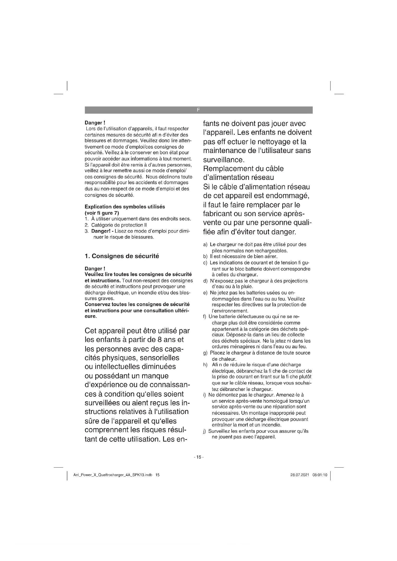 un service après-vente homologué lorsqu’un service après-vente ou une réparation sont nécessaires. Un montage inapproprié peut provoquer une décharge électrique pouvant entraîner la mort et un incendie. j) Surveillez les enfants pour vous assurer qu’ils ne jouent pas avec l’appareil. Anl_Power_X_Quattrocharger_4A_SPK13.indb 15Anl_Power_X_Quattrocharger_4A_SPK13.indb 15 28.07.2021 08:01:1028.07.2021 08:01:10F