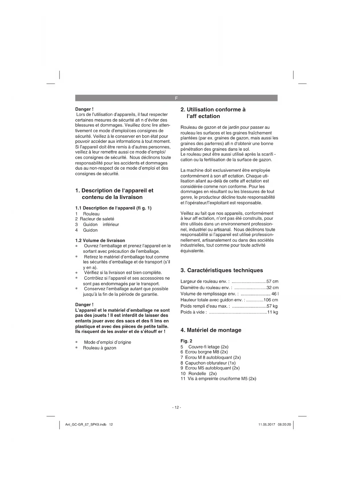 l‘aff ectation Rouleau de gazon et de jardin pour passer au rouleau les surfaces et les graines fraîchement plantées (par ex. graines de gazon, mais aussi les graines des parterres) afi n d‘obtenir une bonne pénétration des graines dans le sol. Le rouleau peut être aussi utilisé après la scarifi - cation ou la fertilisation de la surface de gazon. La machine doit exclusivement être employée conformément à son aff ectation. Chaque uti- lisation allant au-delà de cette aff ectation est considérée comme non conforme. Pour les dommages en résultant ou les blessures de tout genre, le producteur décline toute responsabilité et l’opérateur/l’exploitant est responsable. Veillez au fait que nos appareils, conformément à leur aff ectation, n’ont pas été construits, pour être utilisés dans un environnement profession- nel, industriel ou artisanal. Nous déclinons toute responsabilité si l’appareil est utilisé profession- nellement, artisanalement ou dans des sociétés industrielles, tout comme pour toute activité équivalente.