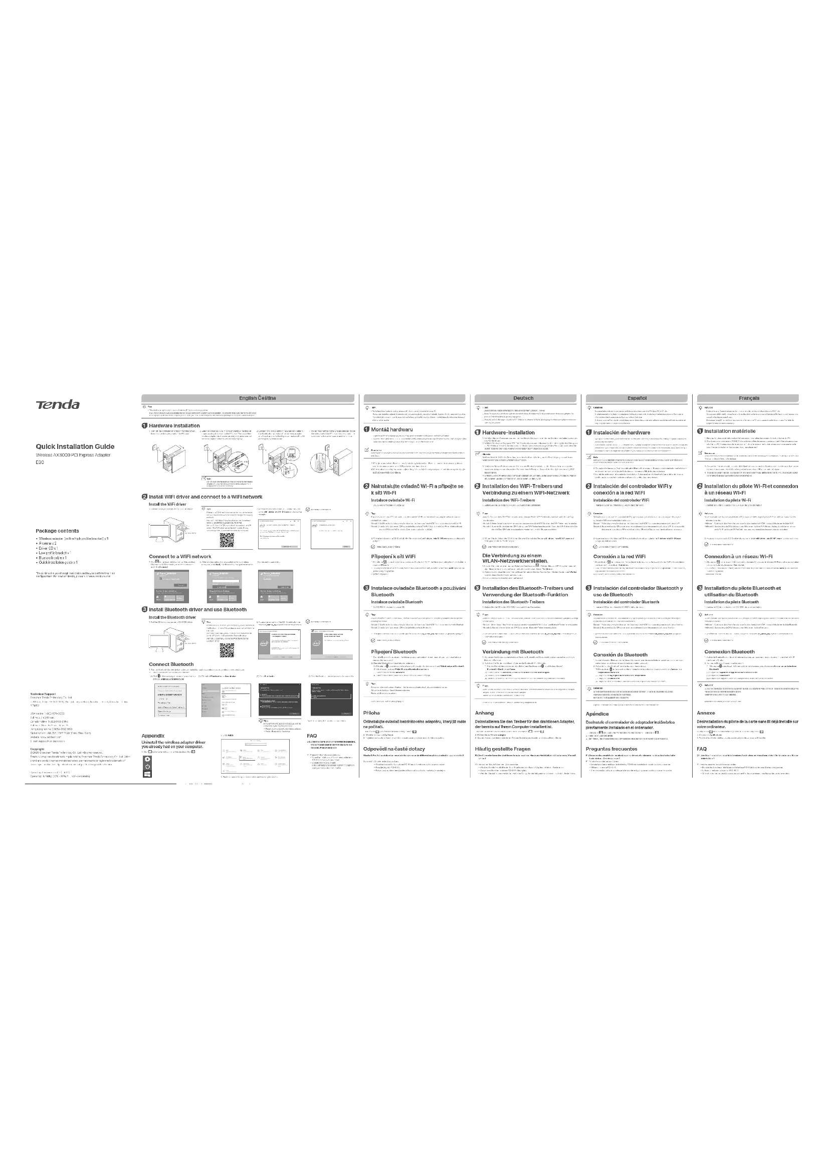 - Quick installation guide x 1 Package contents The guide walks you through installation and how to perform first-time configurations. For product details, please visit www.tendacn.com. Poznámka Nedotýkejte se kovových kolíků konektoru na bezdrátovém adaptéru, abyste bezdrátový adaptér nepoškodili statickou elektřinou. Français Astuces − Cette carte sans fil prend uniquement en charge le système d'exploitation Windows10 64bits. −Si vous avez déjà installé une carte sans fil, veuillez désinstaller la carte sans fil existante. Référez-vous à l'annexe pour connaître les étapes spécifiques. − Si le support à profil haut est trop long pour le boîtier de votre PC, vous pouvez installer la carte sans fil à l'aide du support à profil bas dans l'emballage. Astuces Si votre ordinateur ne dispose pas de lecteur CD, vous pouvez télécharger le pilote Wi-Fi de cette carte sans fil via les méthodes suivantes.Méthode 1: Accédez à https://www.tendacn.com/en/download/detail-3734.html pour télécharger le pilote Wi-Fi.Méthode 2: Scannez le code QR ci-dessous pour télécharger le pilote Wi-Fi. En cas d'échec du téléchargement du pilote Wi-Fi via le code QR WeChat, nous vous recommandons d'essayer avec un navigateur. Astuces Si vous ne trouvez pas le périphérique Bluetooth auquel vous souhaitez vous connecter, essayez les solutions suivantes.Placez l'appareil à proximité de la carte sans fil.Redémarrez le Bluetooth pour l'appareil. Installation matérielle