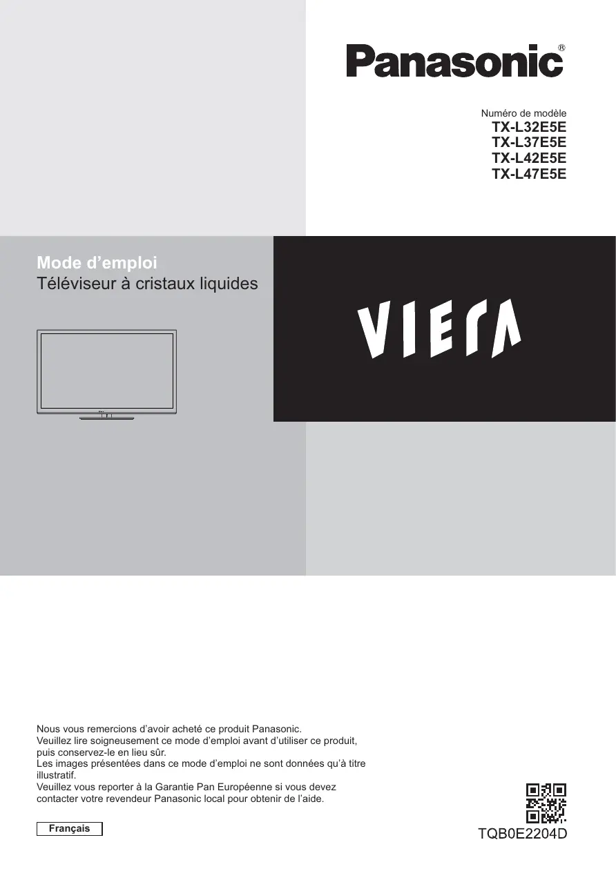 Numéro de modèle TX-L32E5E TX-L37E5E TX-L42E5E TX-L47E5E Mode d’emploi Téléviseur à cristaux liquides Nous vous remercions d’avoir acheté ce produit Panasonic. Veuillez lire soigneusement ce mode d’emploi avant d’utiliser ce produit, puis conservez-le en lieu sûr. Les images présentées dans ce mode d’emploi ne sont données qu’à titre illustratif. Veuillez vous reporter à la Garantie Pan Européenne si vous devez contacter votre revendeur Panasonic local pour obtenir de l’aide. Français Note pour les fonctions DVB / Diffusion de données / IPTV Ce téléviseur est conçu pour respecter les normes (en date du mois d’août 2011) des services numériques terrestres DVB-T (MPEG2 et MPEG4-AVC(H.264)) et des services numériques par câble DVB-C (MPEG2 et MPEG4AVC(H.264)). Veuillez consulter votre revendeur local pour la disponibilité des services DVB-T dans votre région. Consultez votre prestataire de services câblés pour la disponibilité des services DVB-C avec ce téléviseur. Ce téléviseur peut ne pas fonctionner correctement avec un signal qui ne correspond pas aux normes DVB-T ou DVB-C. Toutes les fonctionnalités ne sont pas disponibles en fonction du pays, de la région, du fournisseur de service et de l’environnement du réseau. Tous les modules IC ne fonctionnent pas correctement avec ce téléviseur. Veuillez consulter votre prestataire de services à propos des modules IC disponibles. Il est possible que ce téléviseur ne fonctionne pas correctement avec un module IC non homologué par le prestataire de services. Des frais supplémentaires peuvent être facturés selon le prestataire de services. La compatibilité avec les futurs services n’est pas garantie. Vérifiez les dernières informations concernant les services disponibles sur le site Web suivant. (uniquement en anglais) http://panasonic.jp/support/global/cs/tv/