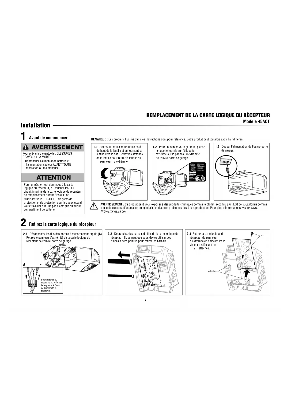 Installation REMPLACEMENT DE LA CARTE LOGIQUE DU RÉCEPTEUR Modèle 45ACT 1.2 Pour conserver votre garantie, placez l’étiquette fournie sur l’étiquette existante sur le panneau d’extrémité de l’ouvre-porte de garage.1.1 Retirez la lentille en tirant les côtés du haut de la lentille et en tournant la lentille vers le bas. Serrez les attaches de la lentille pour retirer la lentille du panneau d’extrémité. REMARQUE : Les produits illustrés dans les instructions sont pour référence. Votre produit peut toutefois avoir l’air différent.