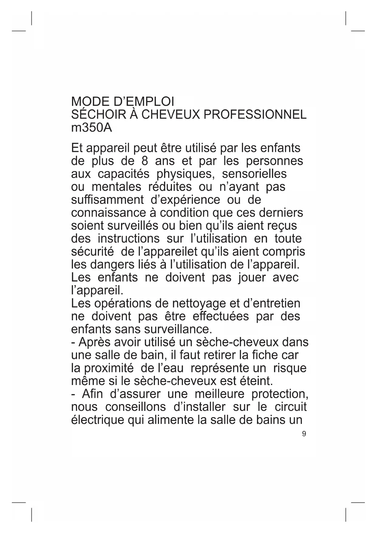 Maintenance After use,switch the appliance o and detach the plug. Clean the equipment thoroughly after each use with a soft and slightly damp cloth. Never use abrasive products or chemical solvents. Attenction: keep dry the appliance. NEVER DIP THE APPLIANCE INTO THE WATER.9 Et appareil peut être utilisé par les enfants de plus de 8 ans et par les personnes aux capacités physiques, sensorielles ou mentales réduites ou n’ayant pas susamment d’expérience ou de connaissance à condition que ces derniers soient surveillés ou bien qu’ils aient reçus des instructions sur l’utilisation en toute sécurité de l’appareilet qu’ils aient compris les dangers liés à l’utilisation de l’appareil. Les enfants ne doivent pas jouer avec l’appareil. Les opérations de nettoyage et d’entretien ne doivent pas être eectuées par des enfants sans surveillance. - Après avoir utilisé un sèche-cheveux dans une salle de bain, il faut retirer la che car la proximité de l’eau représente un risque même si le sèche-cheveux est éteint. - An d’assurer une meilleure protection, nous conseillons d’installer sur le circuit électrique qui alimente la salle de bains un