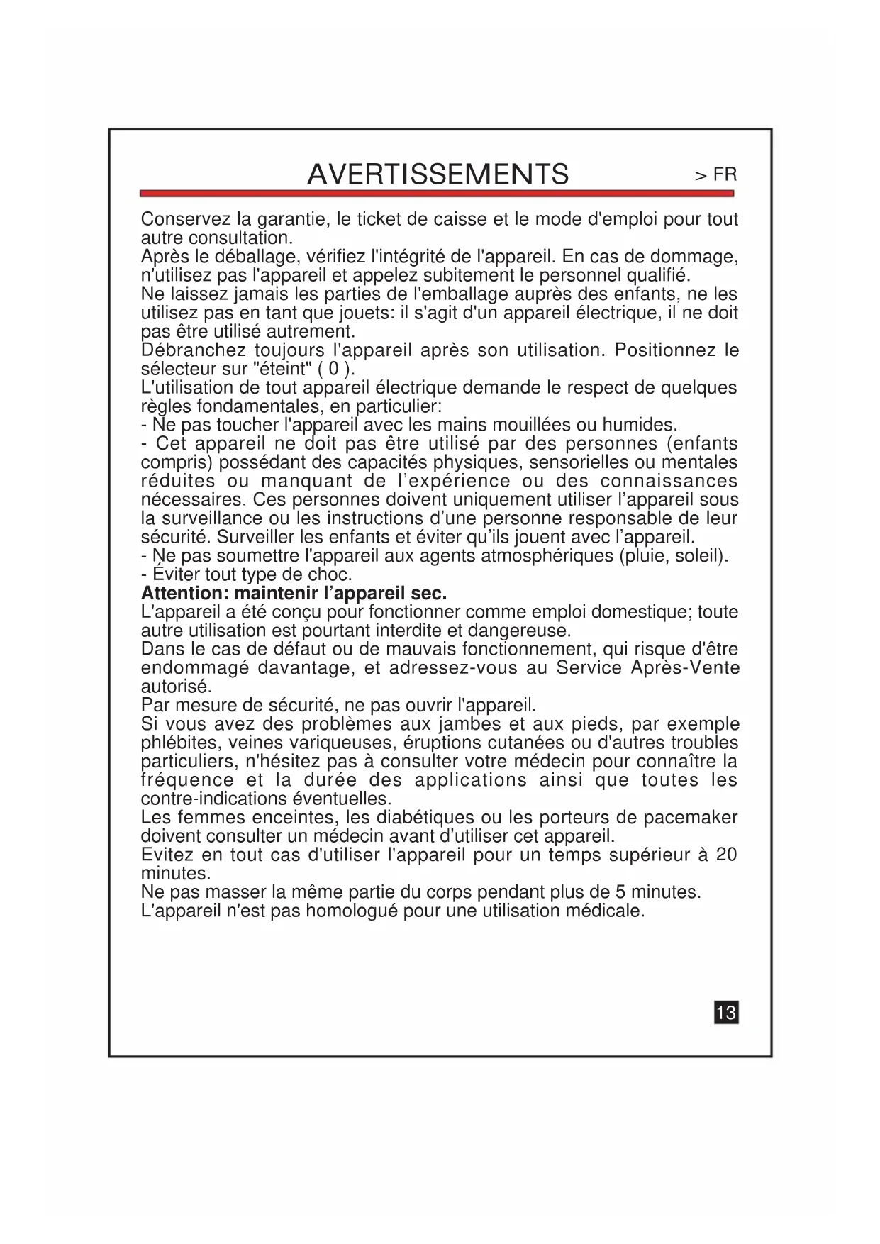 AUTRE CONSULTATION.Conservez la garantie, le ticket de caisse et le mode d'emploi pour tout autre consultation. Après le déballage, vérifiez l'intégrité de l'appareil. En cas de dommage, n'utilisez pas l'appareil et appelez subitement le personnel qualifié. Ne laissez jamais les parties de l'emballage auprès des enfants, ne les utilisez pas en tant que jouets: il s'agit d'un appareil électrique, il ne doit pas être utilisé autrement. Débranchez toujours l'appareil après son utilisation. Positionnez le sélecteur sur "éteint" ( 0 ). L'utilisation de tout appareil électrique demande le respect de quelques règles fondamentales, en particulier: - Ne pas toucher l'appareil avec les mains mouillées ou humides. - Cet appareil ne doit pas être utilisé par des personnes (enfants compris) possédant des capacités physiques, sensorielles ou mentales réduites ou manquant de l’expérience ou des connaissances nécessaires. Ces personnes doivent uniquement utiliser l’appareil sous la surveillance ou les instructions d’une personne responsable de leur sécurité. Surveiller les enfants et éviter qu’ils jouent avec l’appareil. - Ne pas soumettre l'appareil aux agents atmosphériques (pluie, soleil). - Éviter tout type de choc. Attention: maintenir l’appareil sec. L'appareil a été conçu pour fonctionner comme emploi domestique; toute autre utilisation est pourtant interdite et dangereuse. Dans le cas de défaut ou de mauvais fonctionnement, qui risque d'être endommagé davantage, et adressez-vous au Service Après-Vente autorisé. Par mesure de sécurité, ne pas ouvrir l'appareil. Si vous avez des problèmes aux jambes et aux pieds, par exemple phlébites, veines variqueuses, éruptions cutanées ou d'autres troubles particuliers, n'hésitez pas à consulter votre médecin pour connaître la fréquence et la durée des applications ainsi que toutes les contre-indications éventuelles. Les femmes enceintes, les diabétiques ou les porteurs de pacemaker doivent consulter un médecin avant d’utiliser cet appareil. Evitez en tout cas d'utiliser l'appareil pour un temps supérieur à 20 minutes. Ne pas masser la même partie du corps pendant plus de 5 minutes. L'appareil n'est pas homologué pour une utilisation médicale. AVERTISSEMENTS >FR