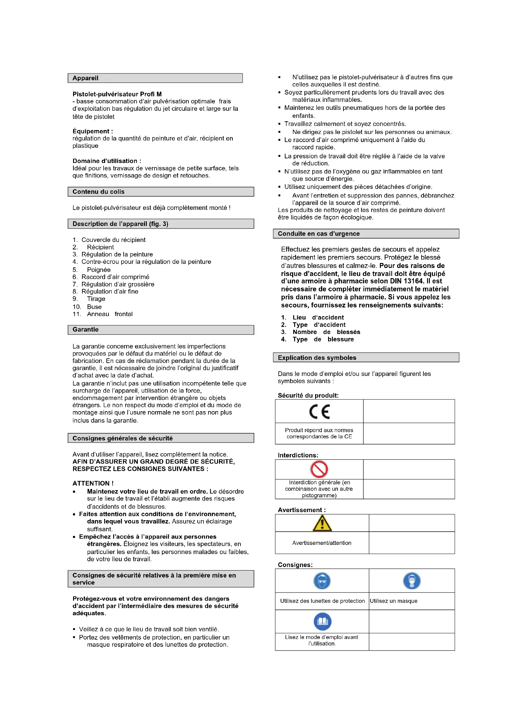 • Empêchez l’accès à l’appareil aux personnes étrangères. Éloignez les visiteurs, les spectateurs, en particulier les enfants, les personnes malades ou faibles, de votre lieu de travail. Consignes de sécurité relatives à la première mise en service Protégez-vous et votre environnement des dangers d’accident par l’intermédiaire des mesures de sécurité adéquates. Veillez à ce que le lieu de travail soit bien ventilé. Portez des vetêments de protection, en particulier un masque respiratoire et des lunettes de protection. N’utilisez pas le pistolet-pulvérisateur à d’autres fins que celles auxquelles il est destiné. Soyez particulièrement prudents lors du travail avec des matériaux inflammables. Maintenez les outils pneumatiques hors de la portée des enfants. Travaillez calmement et soyez concentrés. Ne dirigez pas le pistolet sur les personnes ou animaux. Le raccord d’air comprimé uniquement à l’aide du raccord rapide. La pression de travail doit être réglée à l’aide de la valve de réduction. N’utilisez pas de l’oxygène ou gaz inflammables en tant que source d’énergie. Utilisez uniquement des pièces détachées d’origine. Avant l’entretien et suppression des pannes, débranchez l’appareil de la source d’air comprimé. Les produits de nettoyage et les restes de peinture doivent être liquidés de façon écologique. Conduite en cas d’urgence Effectuez les premiers gestes de secours et appelez rapidement les premiers secours. Protégez le blessé d’autres blessures et calmez-le. Pour des raisons de risque d’accident, le lieu de travail doit être équipé d’une armoire à pharmacie selon DIN 13164. Il est nécessaire de compléter immédiatement le matériel pris dans l’armoire à pharmacie. Si vous appelez les secours, fournissez les renseignements suivants: