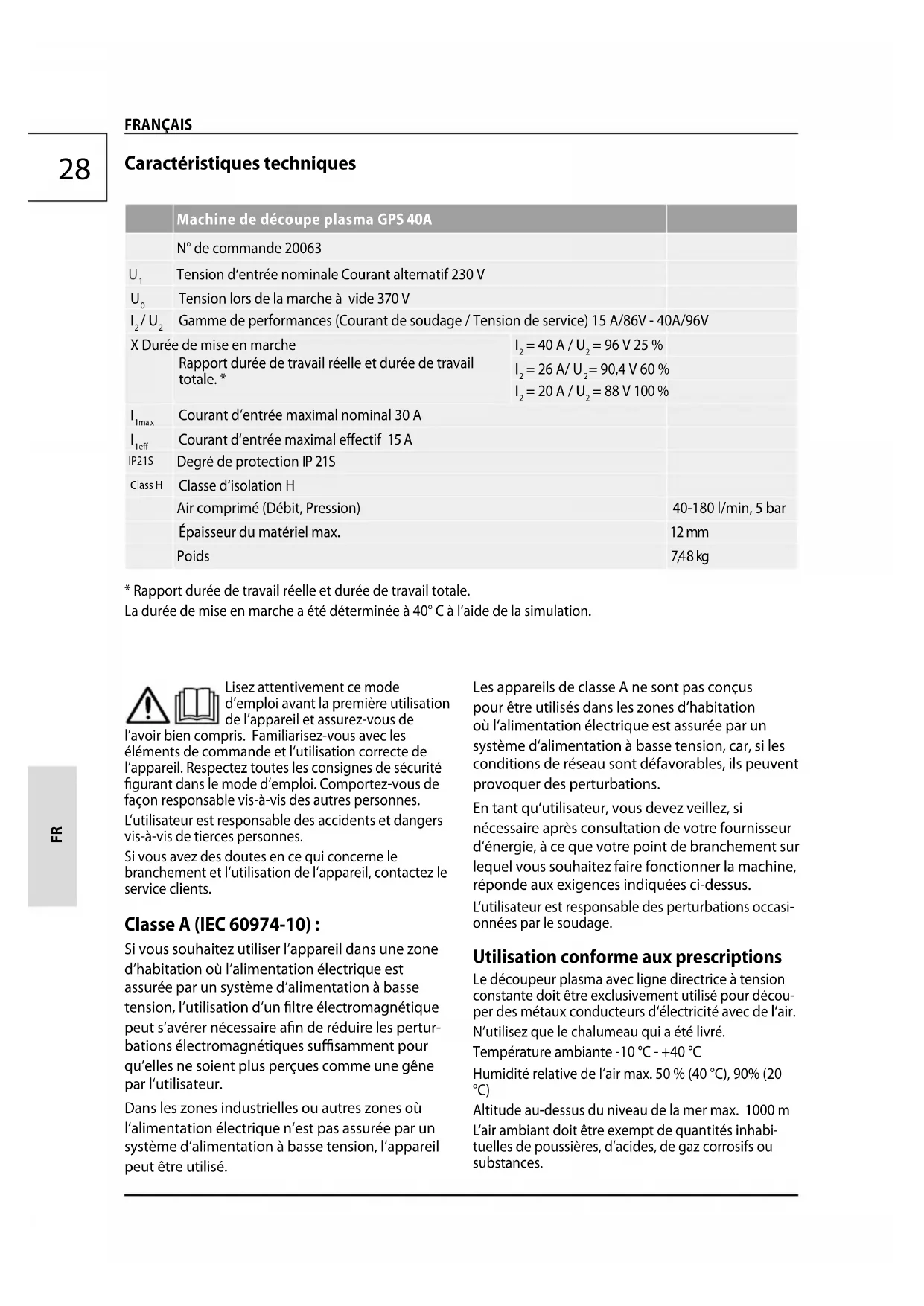 - Rapport durée de travail réelle et durée de travail totale. La durée de mise en marche a été déterminée à 40° C à l‘aide de la simulation. FRANÇAIS Lisez attentivement ce mode d’emploi avant la première utilisation de l’appareil et assurez-vous de l’avoir bien compris. Familiarisez-vous avec les éléments de commande et l‘utilisation correcte de l‘appareil. Respectez toutes les consignes de sécurité gurant dans le mode d’emploi. Comportez-vous de façon responsable vis-à-vis des autres personnes. L‘utilisateur est responsable des accidents et dangers vis-à-vis de tierces personnes. Si vous avez des doutes en ce qui concerne le branchement et l‘utilisation de l‘appareil, contactez le service clients. Classe A (IEC 60974-10): Si vous souhaitez utiliser l‘appareil dans une zone d‘habitation où l‘alimentation électrique est assurée par un système d‘alimentation à basse tension, l‘utilisation d‘un ltre électromagnétique peut s‘avérer nécessaire an de réduire les pertur- bations électromagnétiques susamment pour qu‘elles ne soient plus perçues comme une gêne par l‘utilisateur. Dans les zones industrielles ou autres zones où l‘alimentation électrique n‘est pas assurée par un système d‘alimentation à basse tension, l‘appareil peut être utilisé. Les appareils de classe A ne sont pas conçus pour être utilisés dans les zones d‘habitation où l‘alimentation électrique est assurée par un système d‘alimentation à basse tension, car, si les conditions de réseau sont défavorables, ils peuvent provoquer des perturbations. En tant qu‘utilisateur, vous devez veillez, si nécessaire après consultation de votre fournisseur d‘énergie, à ce que votre point de branchement sur lequel vous souhaitez faire fonctionner la machine, réponde aux exigences indiquées ci-dessus. L‘utilisateur est responsable des perturbations occasi- onnées par le soudage. Utilisation conforme aux prescriptions Le découpeur plasma avec ligne directrice à tension constante doit être exclusivement utilisé pour décou- per des métaux conducteurs d‘électricité avec de l‘air. N‘utilisez que le chalumeau qui a été livré. Température ambiante -10 °C - +40 °C Humidité relative de l‘air max. 50 % (40 °C), 90% (20 °C) Altitude au-dessus du niveau de la mer max. 1000 m L‘air ambiant doit être exempt de quantités inhabi