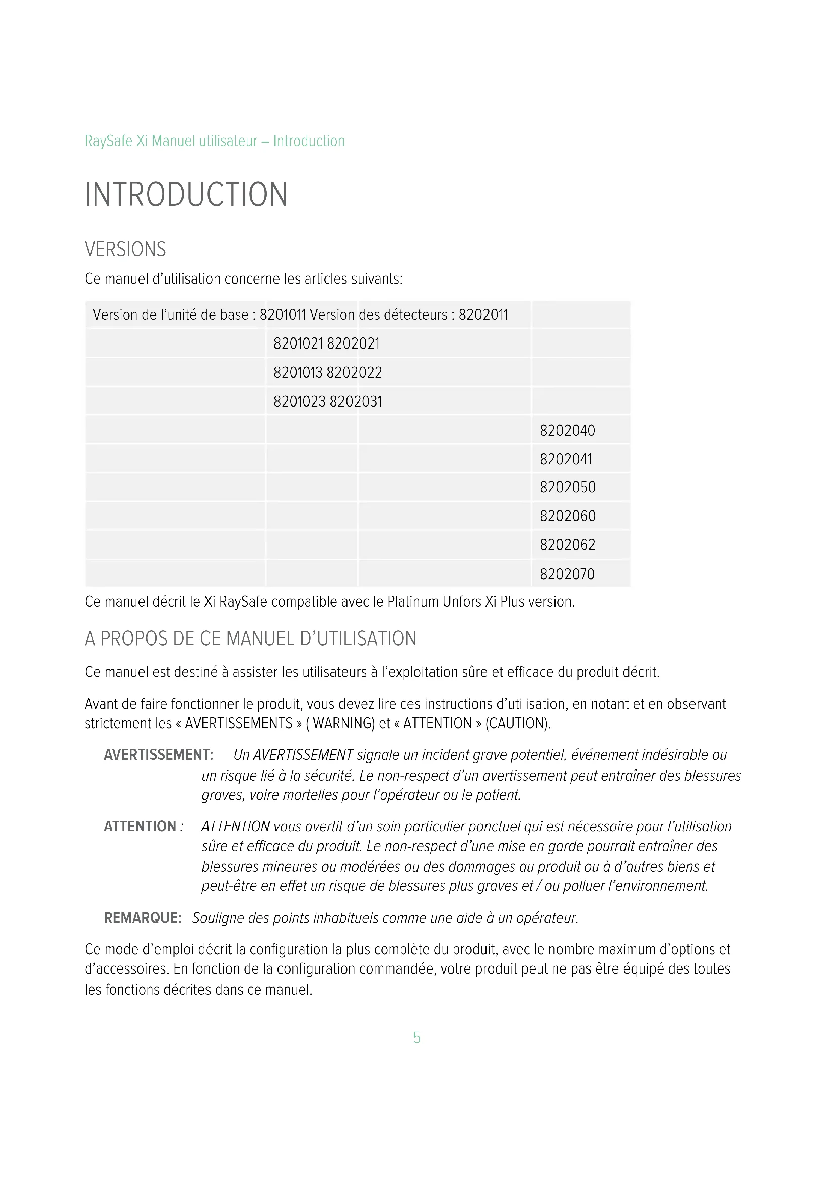 RaySafe Xi Manuel utilisateur – Introduction INTRODUCTION VERSIONS Ce manuel d’utilisation concerne les articles suivants: Version de l’unité de base : 8201011 Version des détecteurs : 8202011